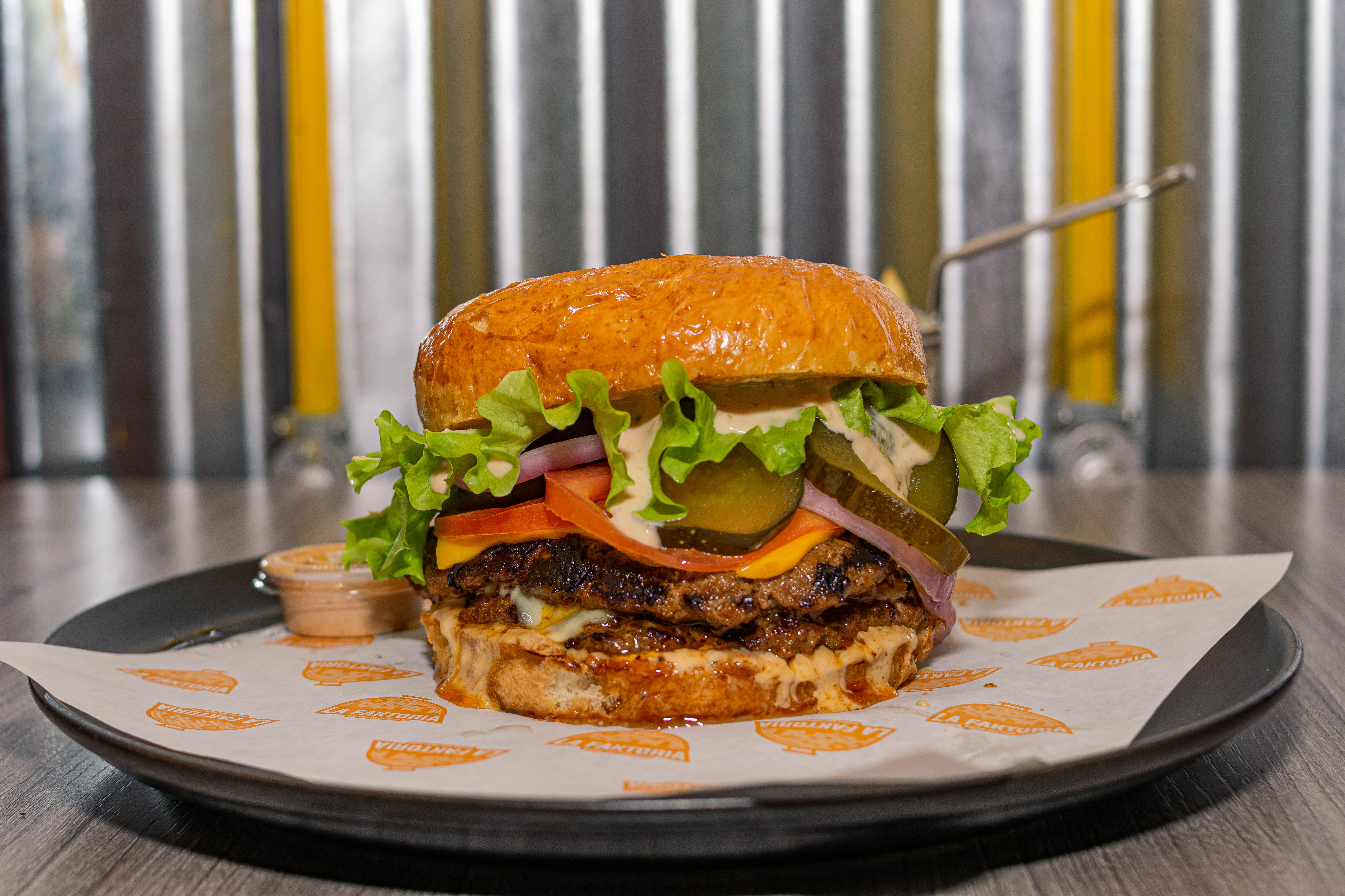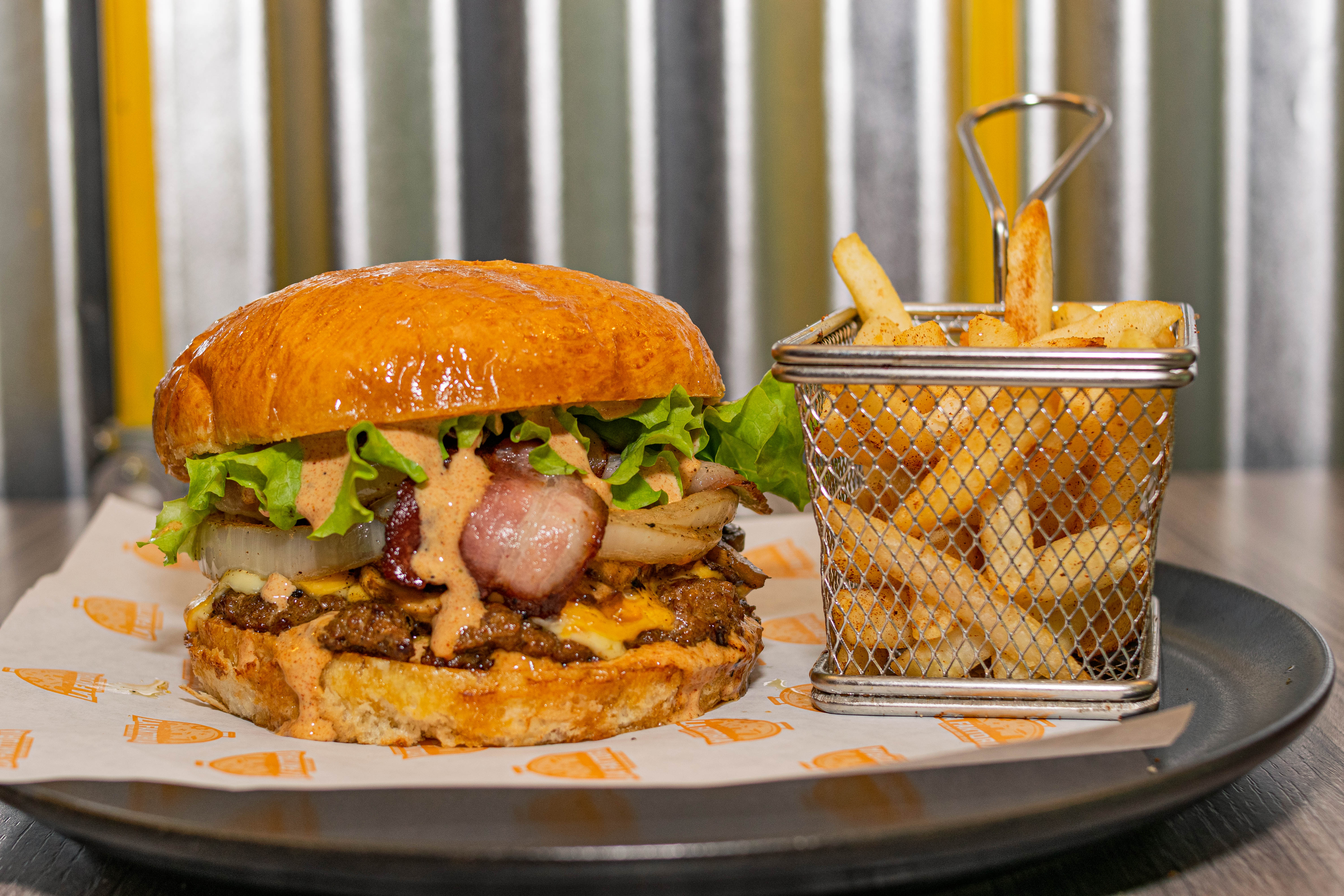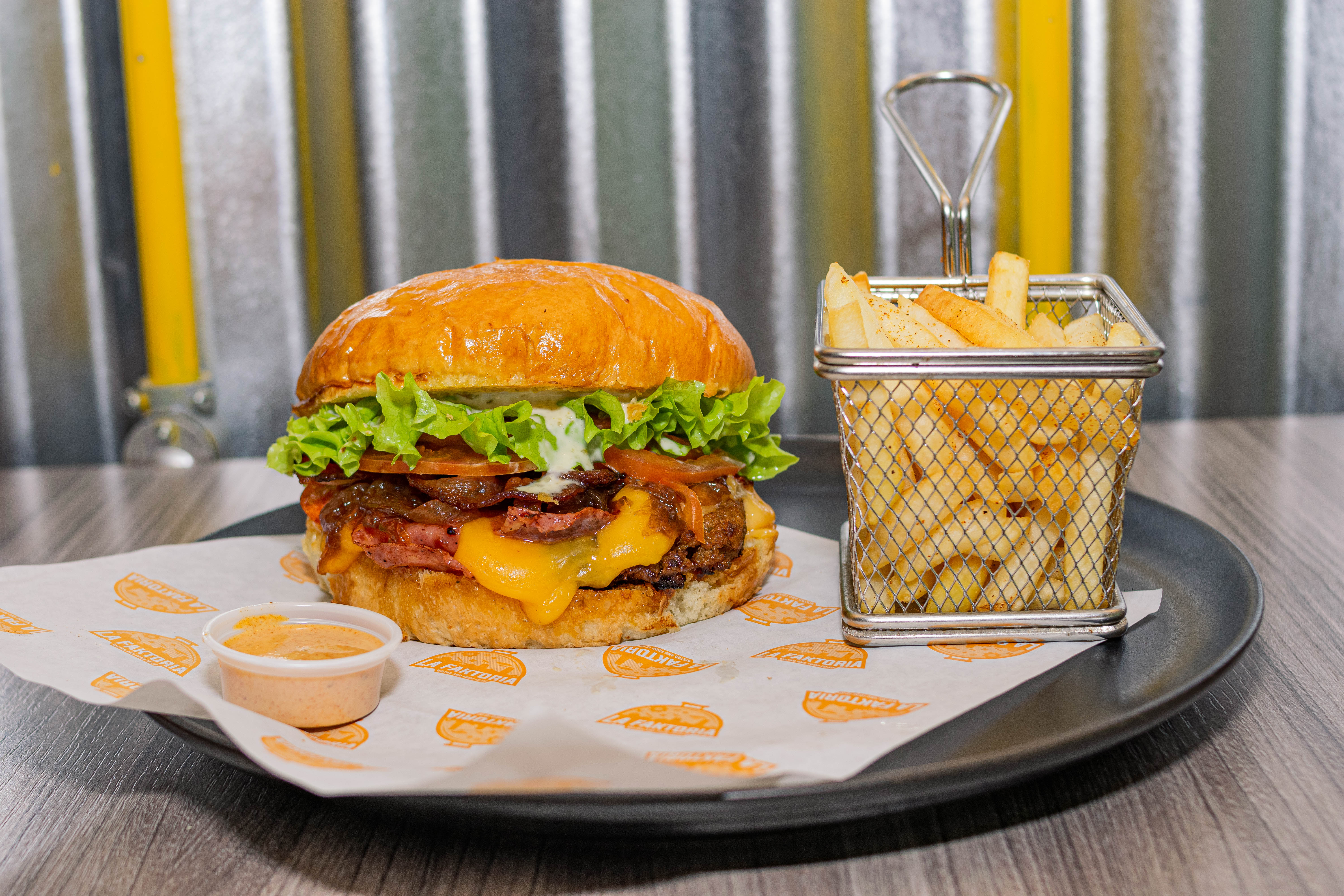 Pan brioche, carne 150 gr, salami, peperoni, tocineta, queso holandés, queso mozzarella, lechuga, cebolla caramelizada, tomate, salsa a base de mayonesa dulce, acompañado con papas.