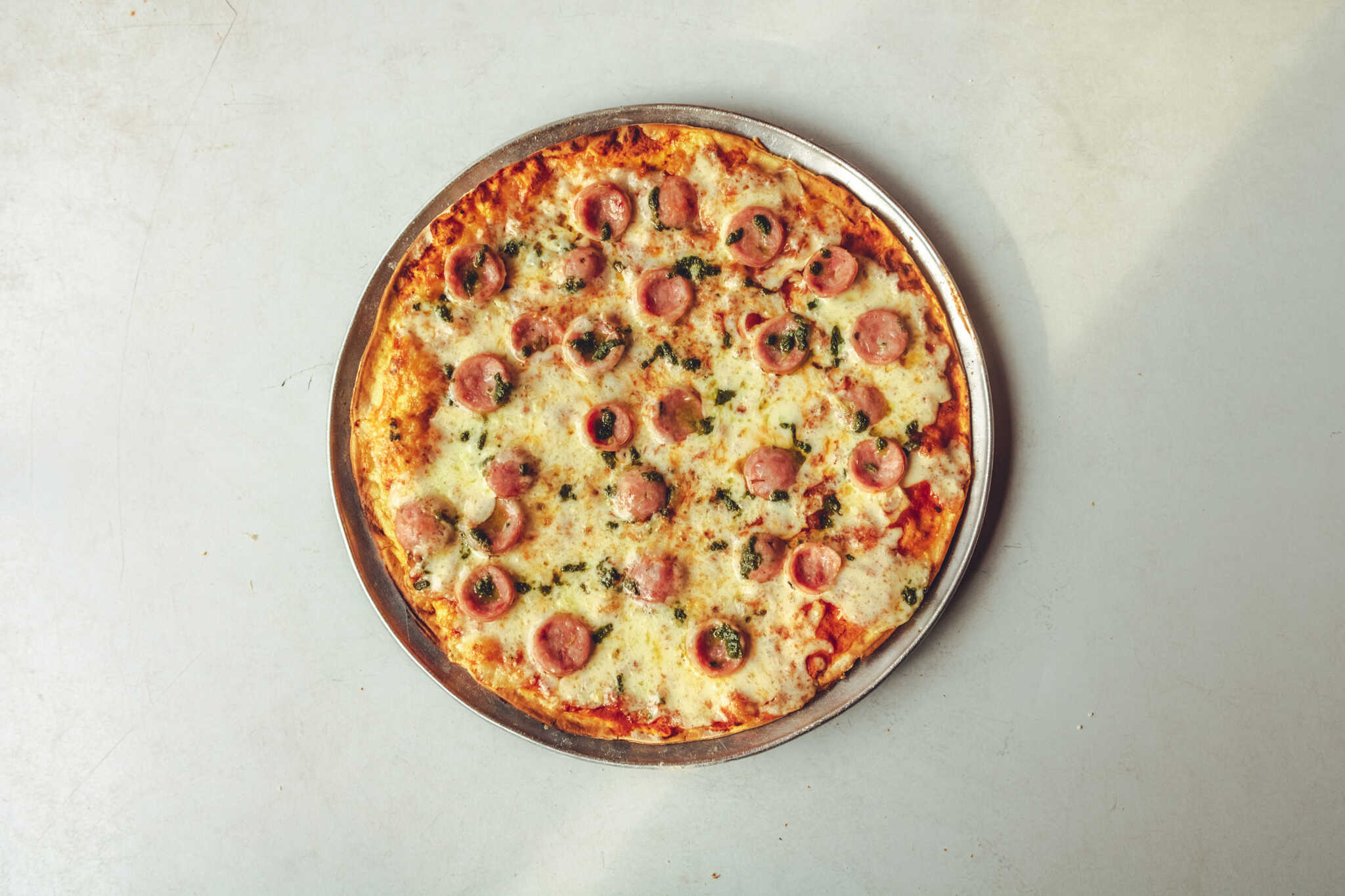 Mozzarella, chorizo, salsa pesto y tocineta.