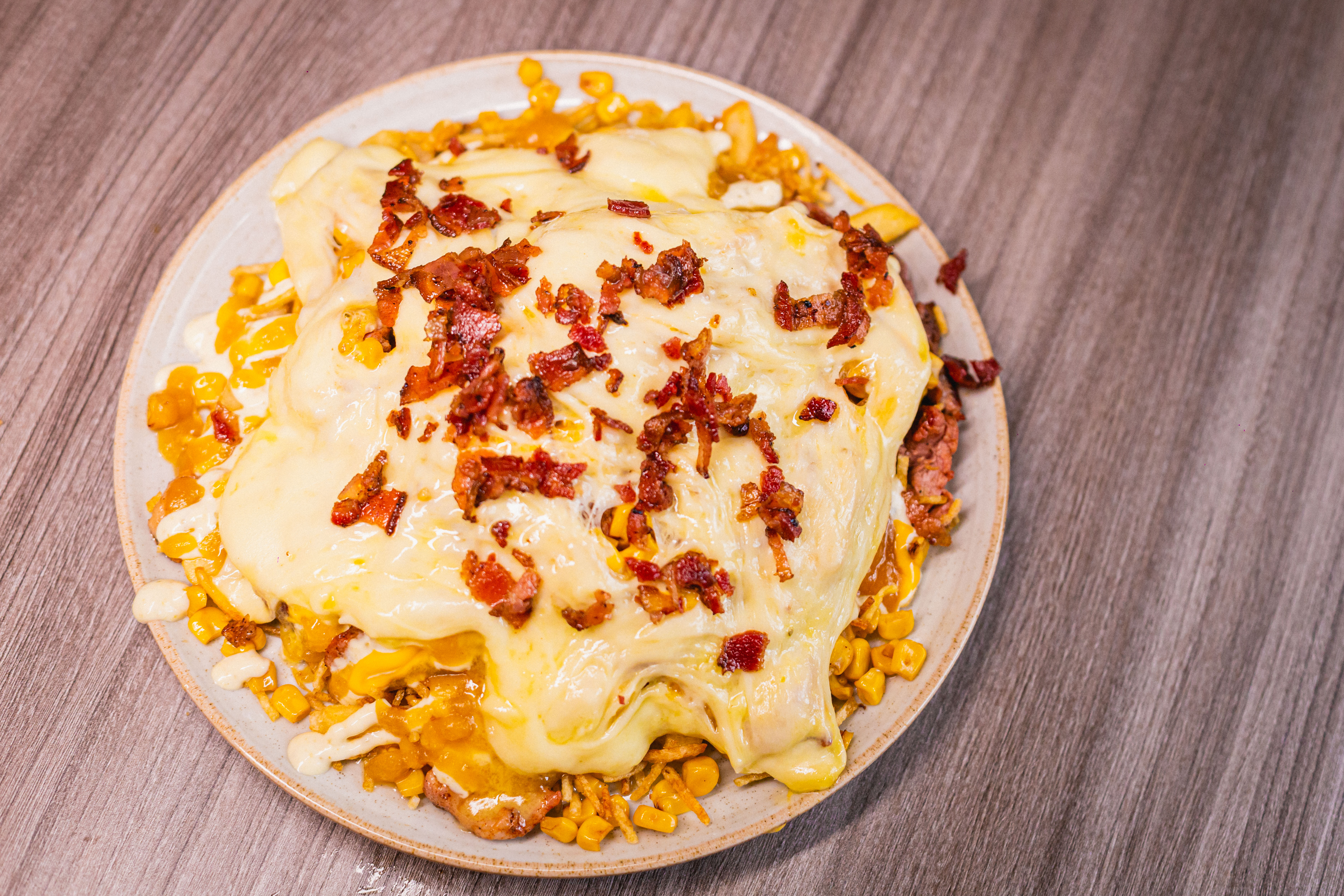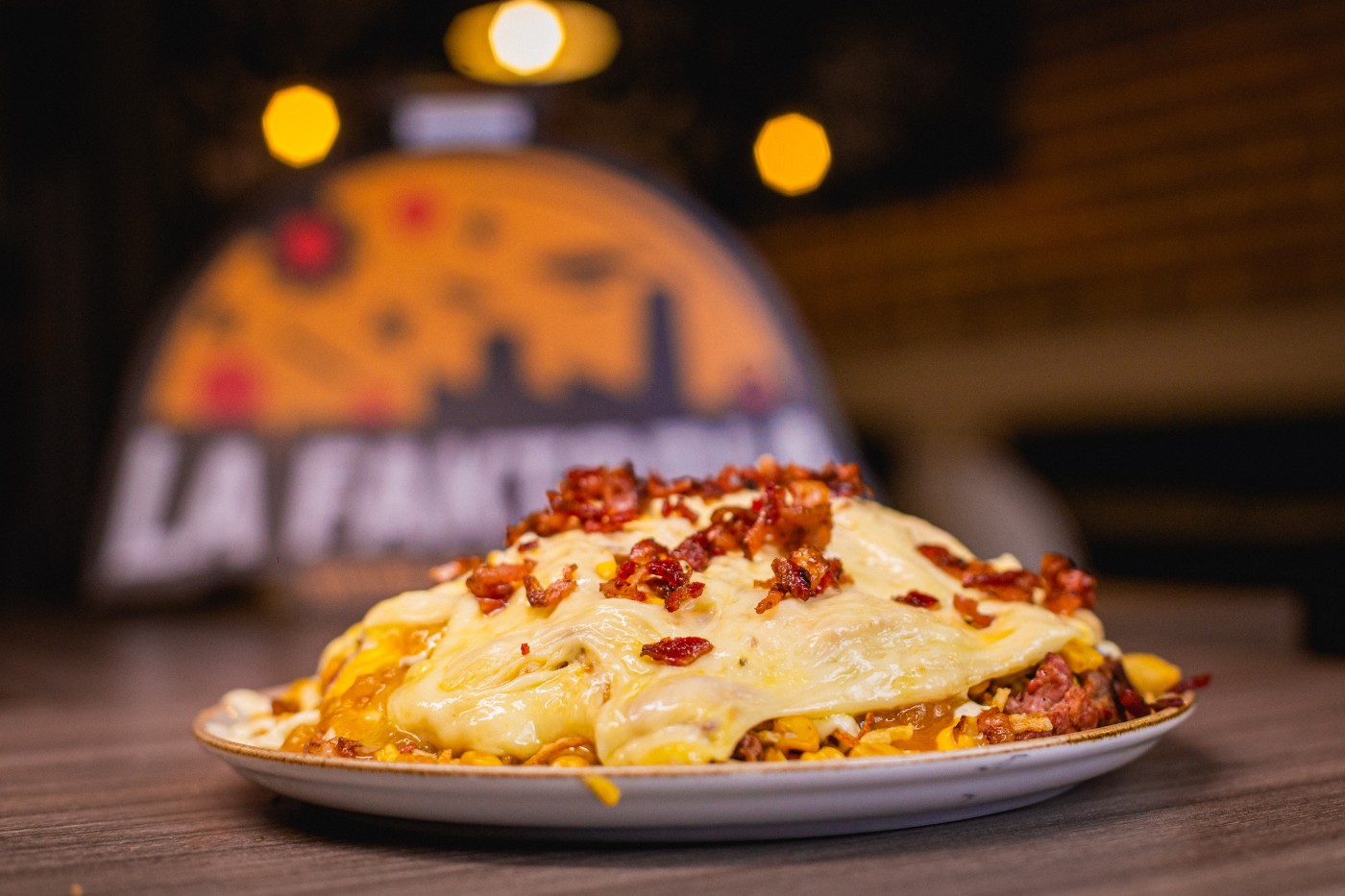 Carne de res, tocineta, papas francesa, maíz, mozzarella, papa ripio, salsa cheddar, salsa piña y tartara.