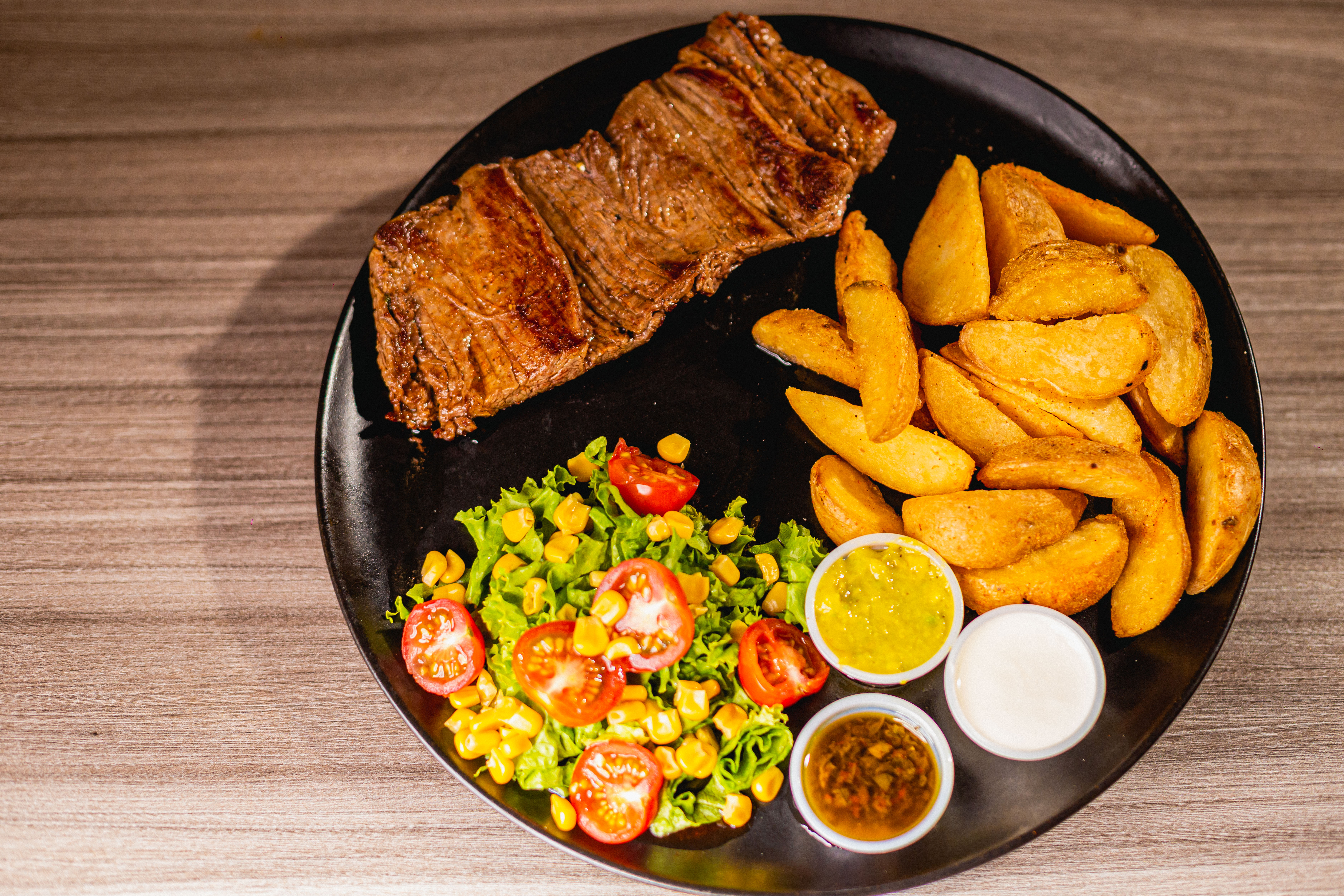 Pan brioche, carne 150 gr, queso cheddar, lechuga, tomate, cebolla roja, pepinillos, salsa de la casa, acompañado con papas.
