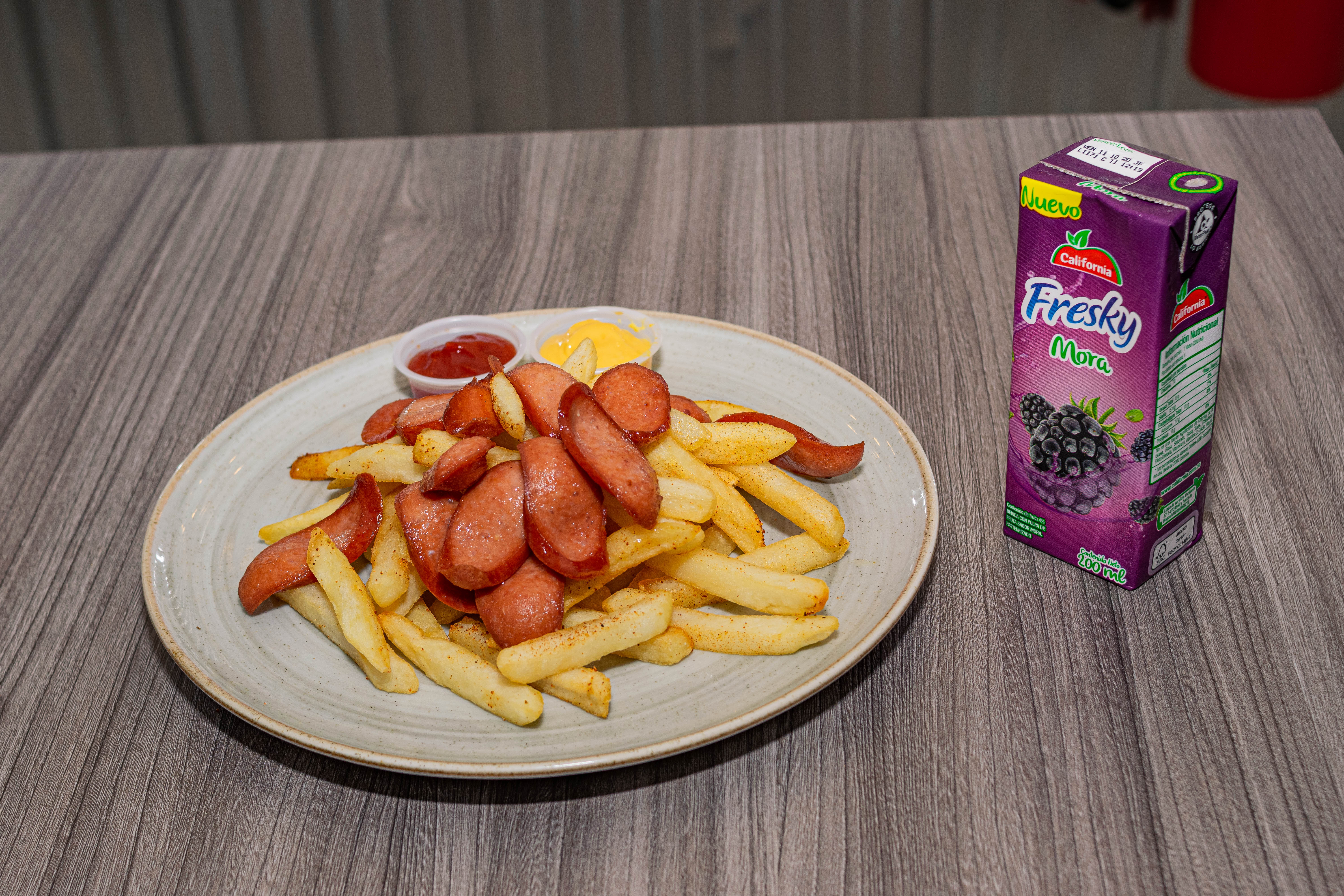 Salchicha, papa francesa y jugo cajita o natumalta.