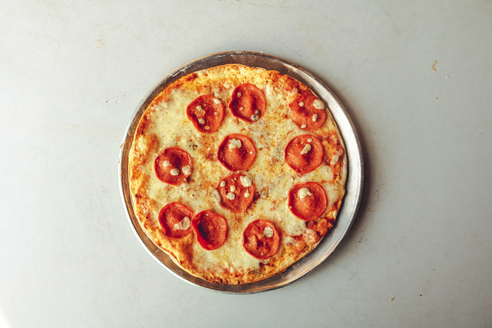 Mozzarella, pepperoni y salami madurados, jamón, chorizo, tiras de jamón serrano madurado y salsa pesto.
