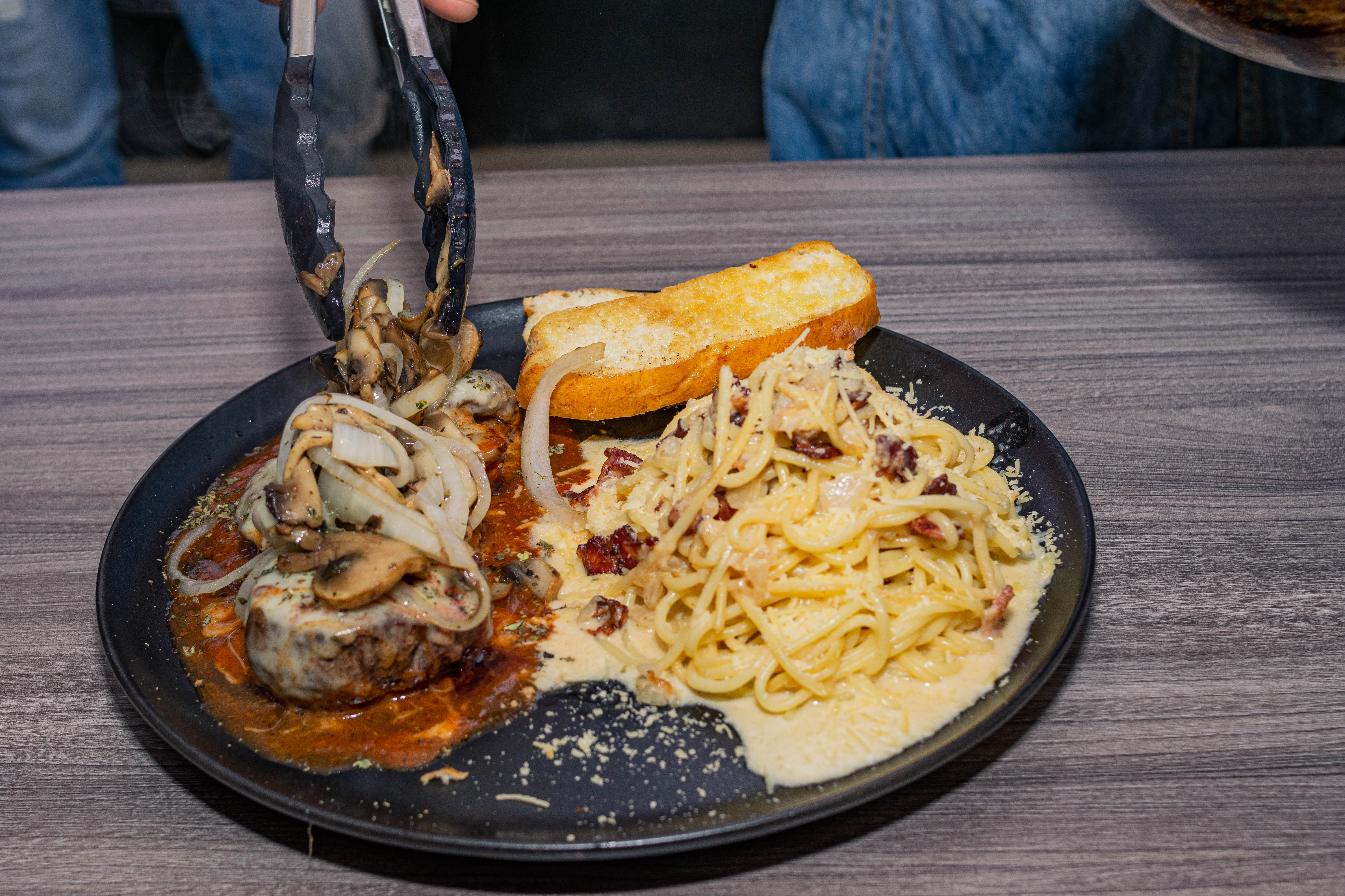 Pan brioche, carne 150 gr, queso mozzarella, queso cheddar, lechuga, tocineta, champiñones, cebolla grille, salsa ahumada, acompañado con papas.