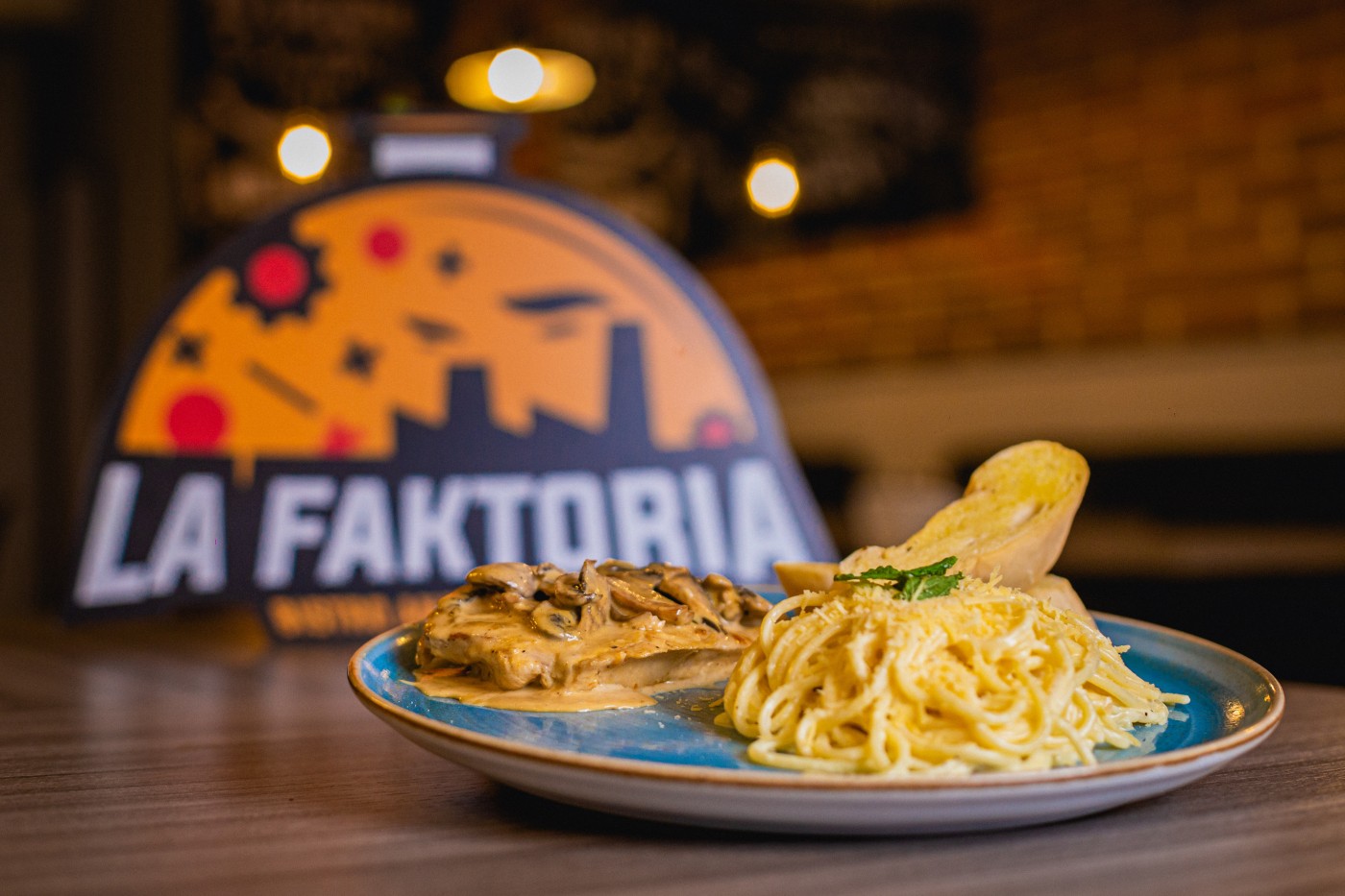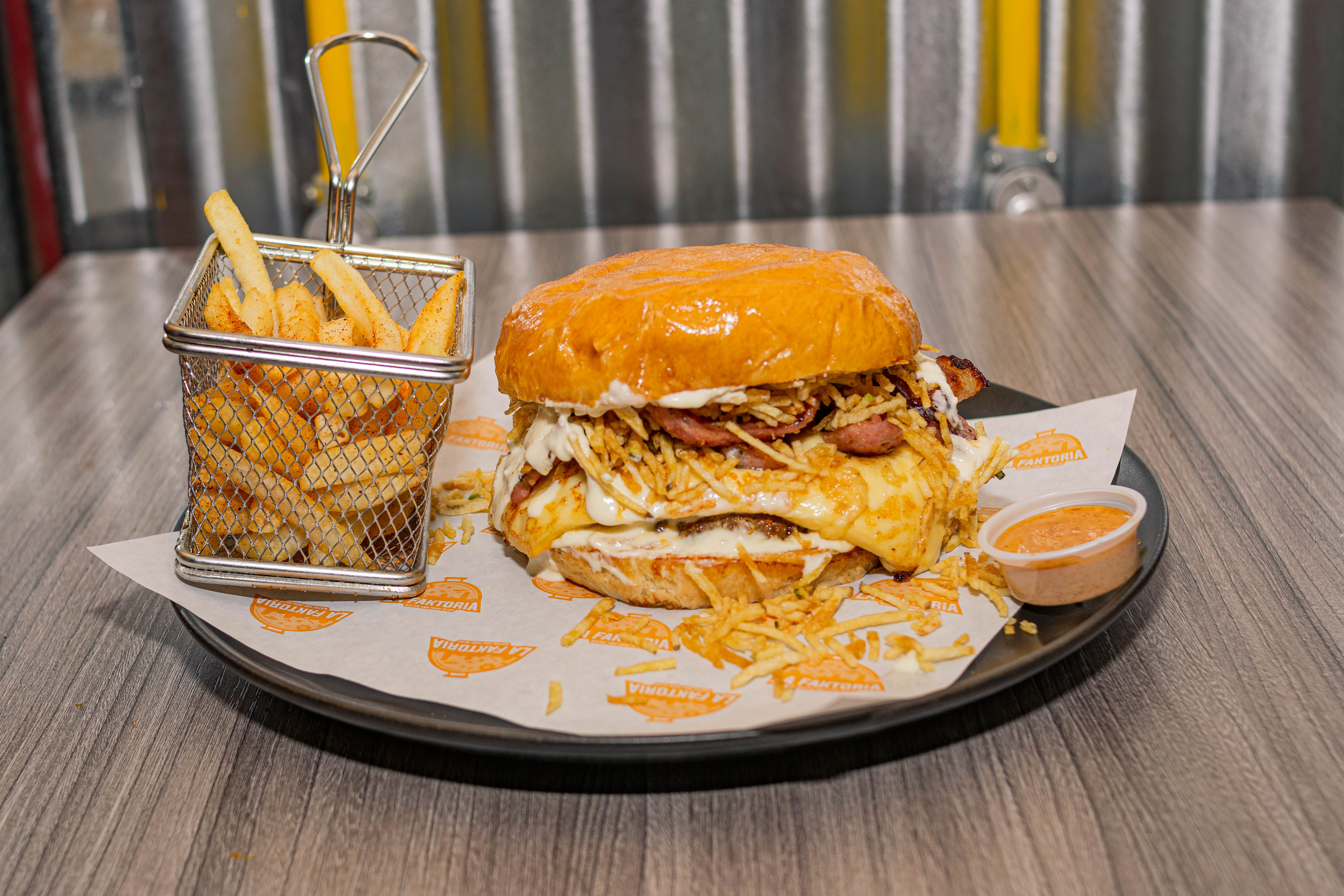 Pan brioche, carne 150 gr, queso Asado, chorizo Santarrosano, tocineta, papa ripio, salsa a faktoria y piña, acompañado con papas.