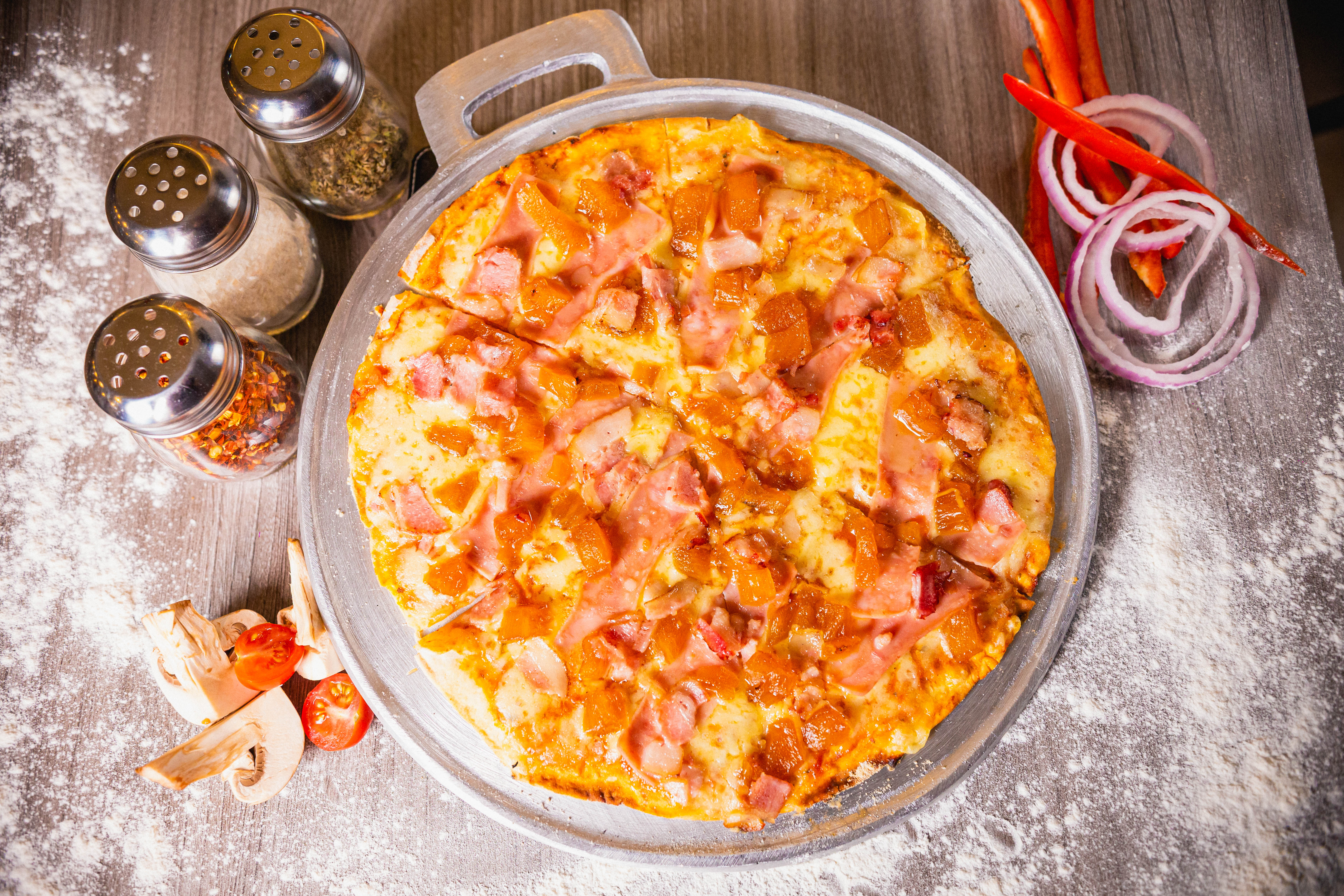 Mozzarella, maíz, pollo, tocineta y queso parmesano.