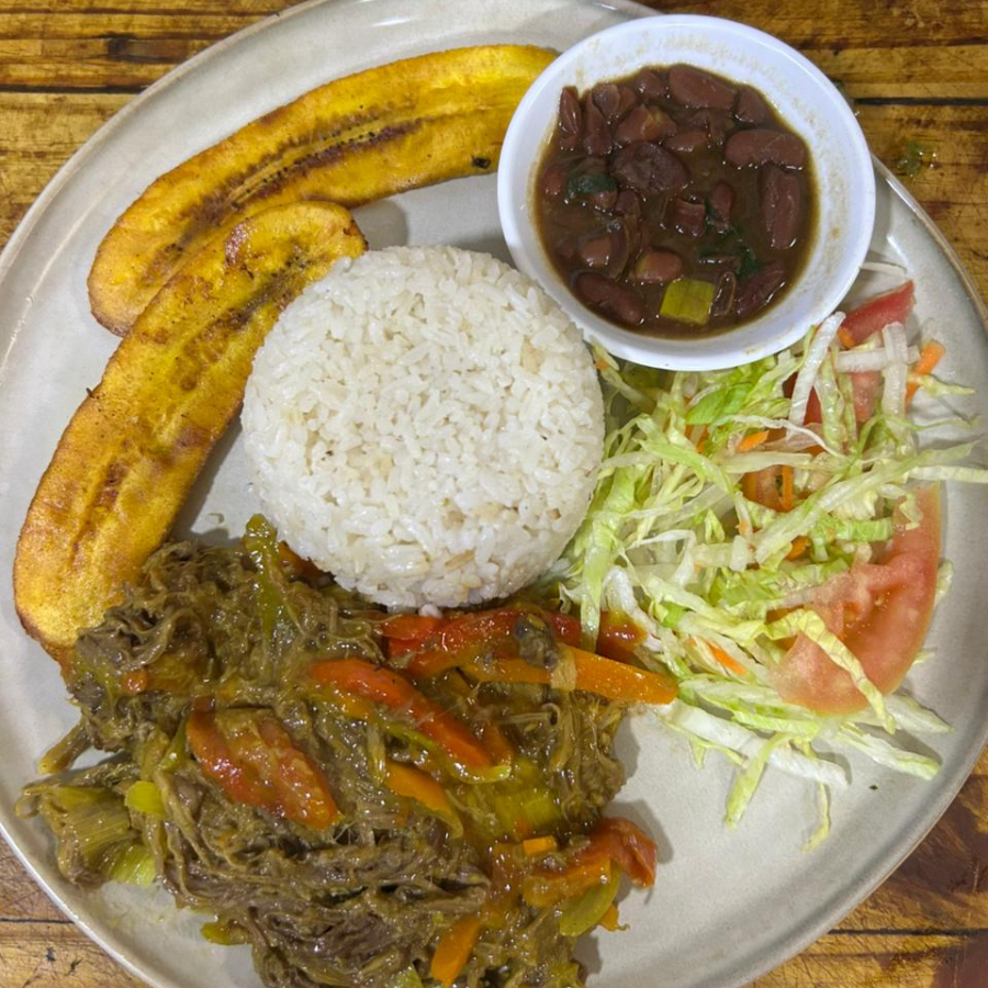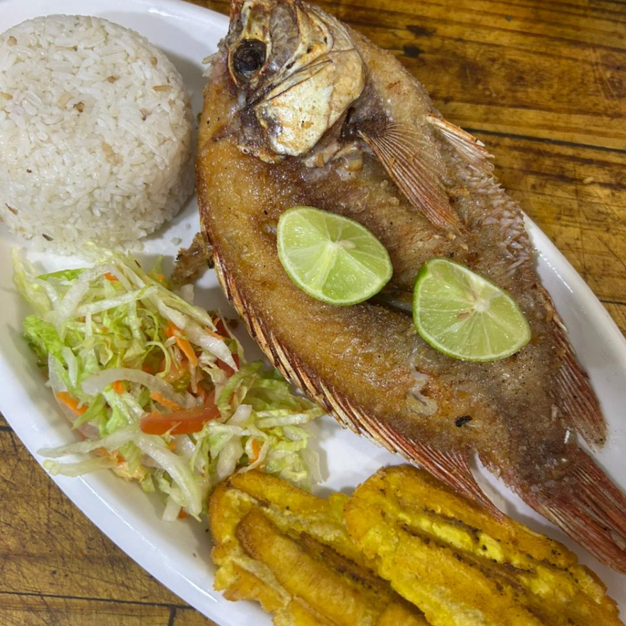 Acompañado de arroz del día, grano del día, ensalada del día, tajadas o plátano maduro, consomé del día(12onz) y bebida