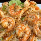 Chop suey de camarón salteado con base de arroz o pasta.
