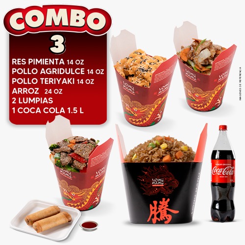 Res Pimienta 14 Onz + Pollo agridulce 14 Onz + pollo teriyaki 14 Onz +Arroz 24 Onz + 2 lumpias + 1 Coca cola Original de 1.5 Litros