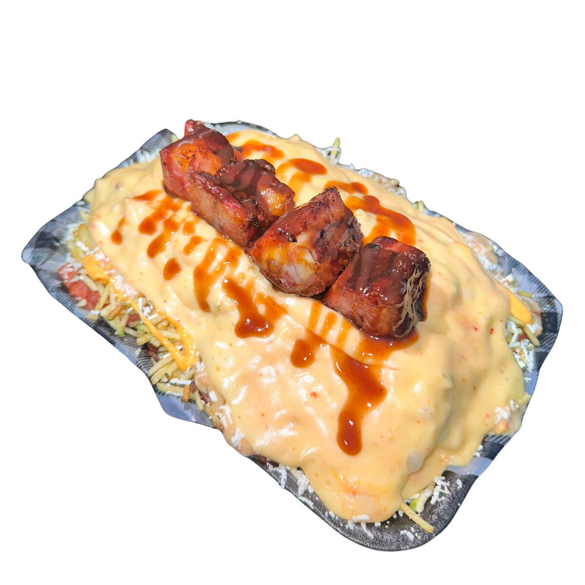 Papas, pollo, chorizo, butifarra, salchicha suiza, queso costeño, lechuga, chongo, maíz, tártara y salsa de queso cheddar.