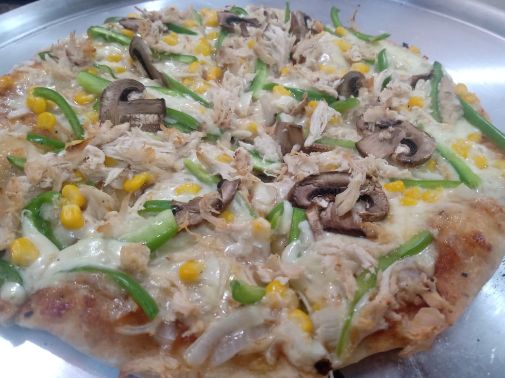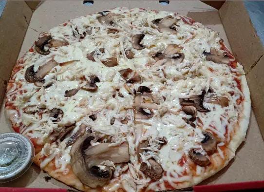 Masa de la casa, salsa napolitana, queso mozzarella, pollo y champiñones frescos.