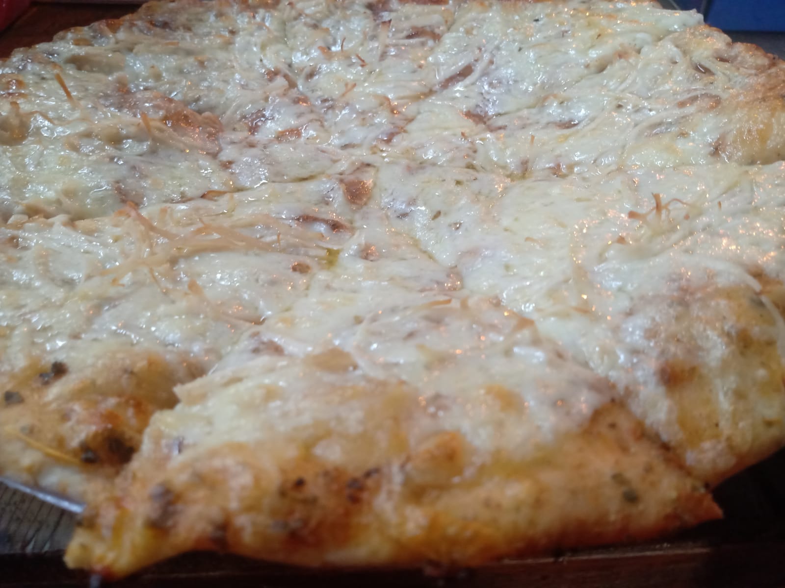 Masa de la casa, salsa napolitana, queso mozzarella y pollo.
