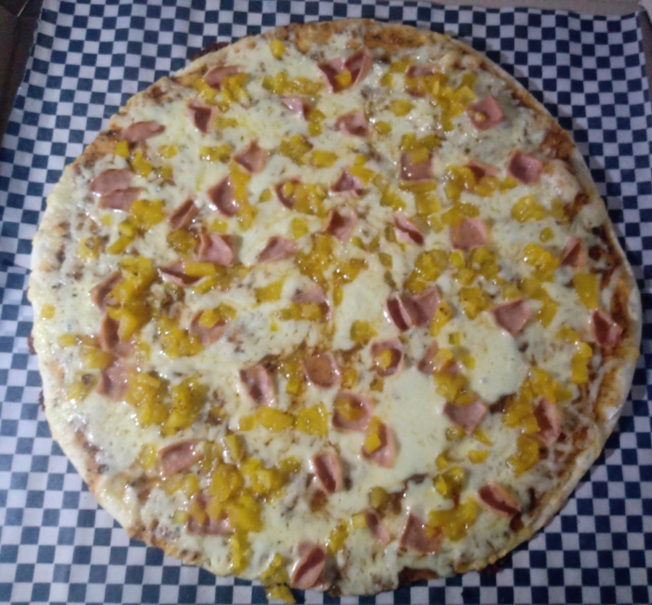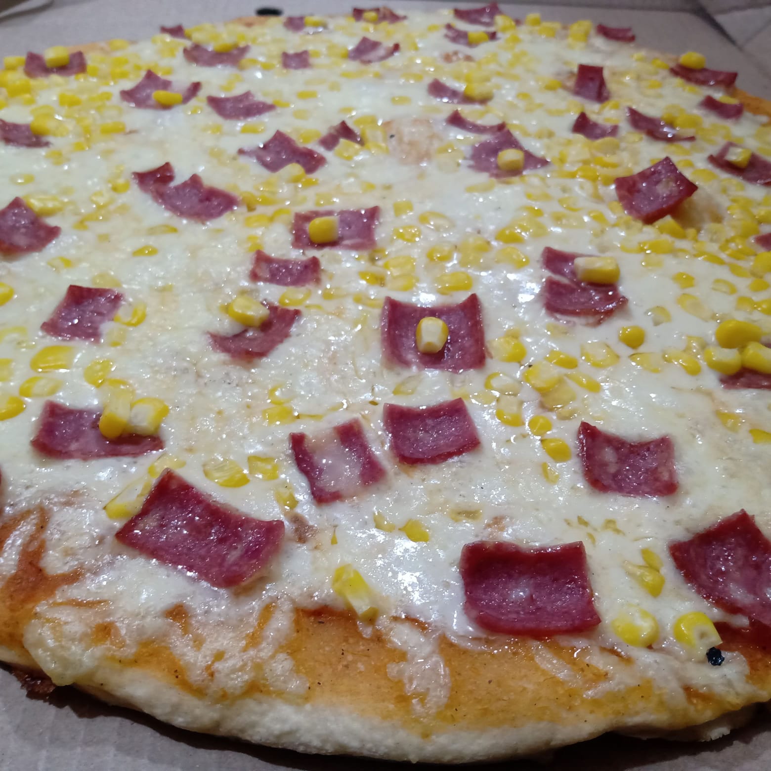 Masa de la casa, salsa napolitana, queso mozzarella, tocineta y maíz tierno.