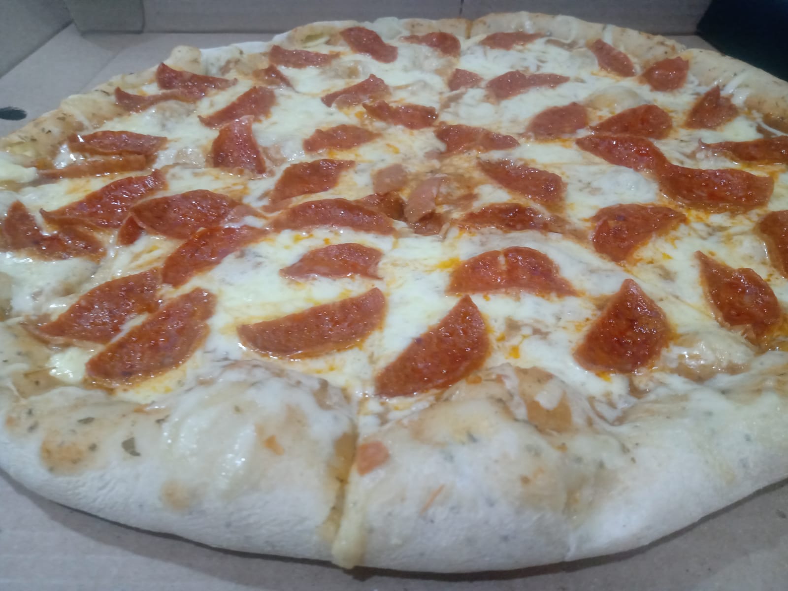 Masa de la casa, queso mozzarella y pepperoni artesanal.