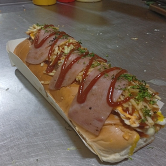 20 cms de pan baguete acompañado con carne embutida, jamon, vegetales frescos y salsa de la casa.