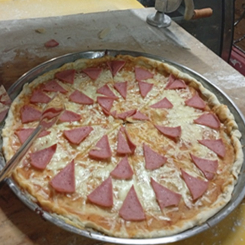14 porciones de Pizza acompañada con jamon, trocitos de chorizo, piña. maiz, queso costeño y queso mozarella