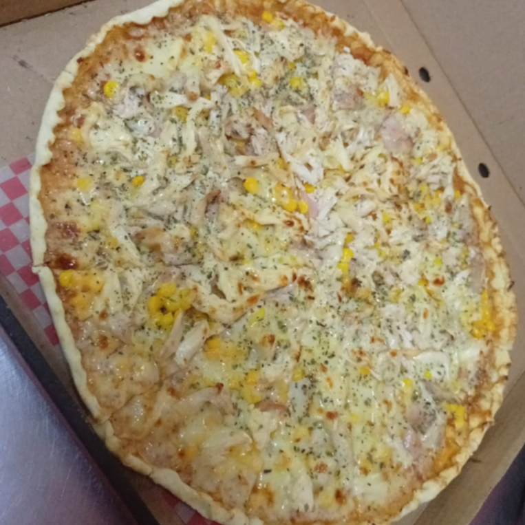 12 porciones de pizzas acompañadas de salami, pollo, maiz, cebolla blanca y queso mozarella.