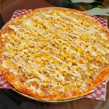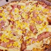 12 porciones de pizza con jamon, maiz, queso costeño, queso mozarella.