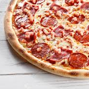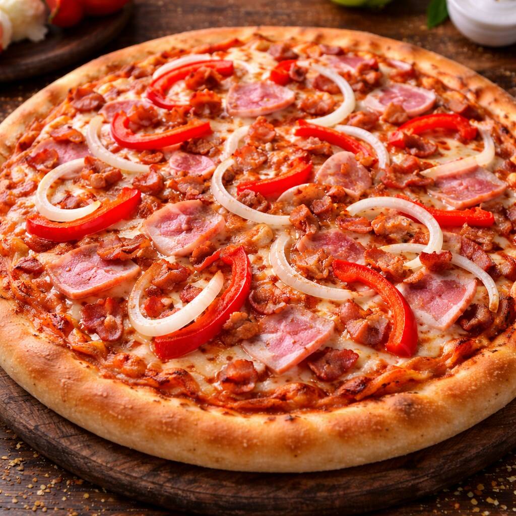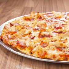12 porciones de pizza crocante acompañada de pollo, jamon, tocineta, pimenton, cebolla blanca y queso mozarella