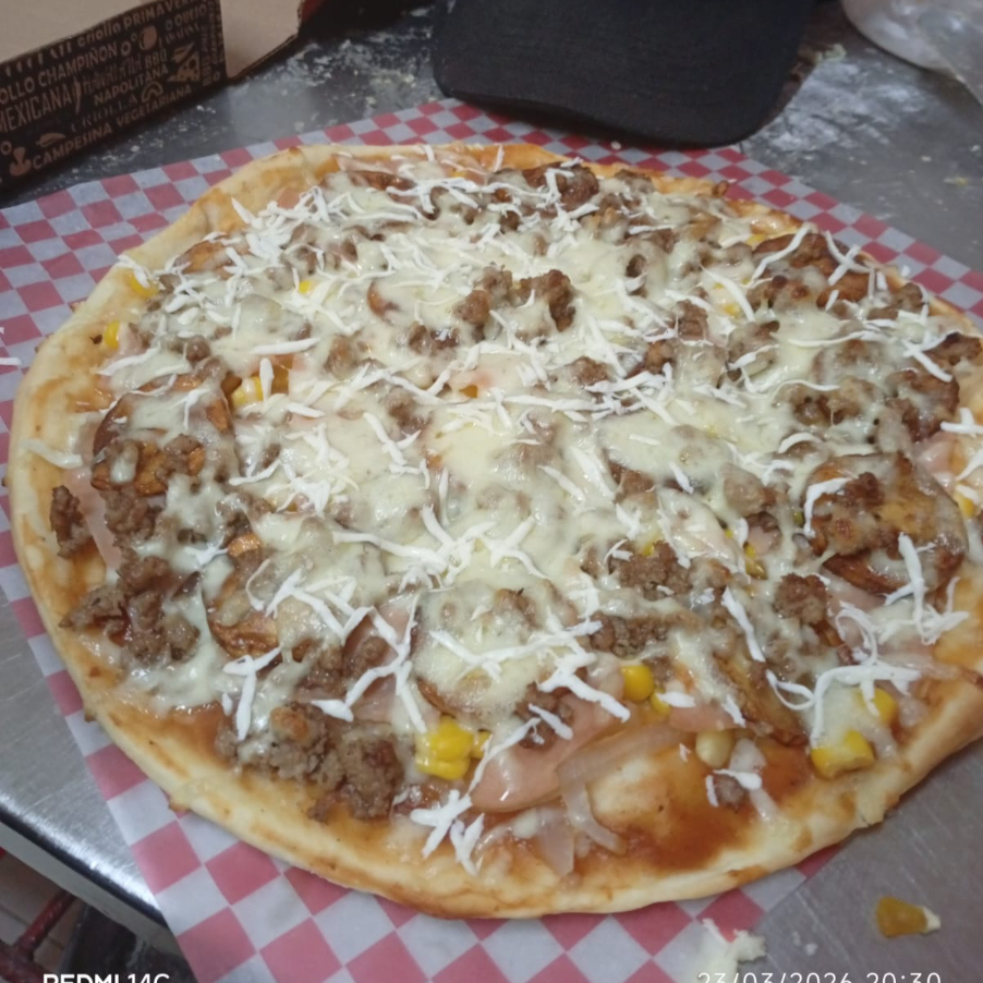 14 porciones de pizza acompañada de pollo, jamon, tocineta, chorizo y queso mozarella