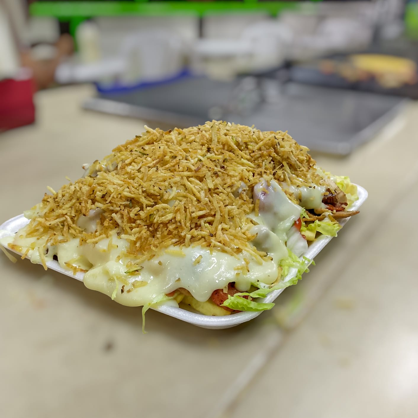 Papas francesas, lechuga, pollo, carne, chorizo, butifarra, salsas, papa ripio y queso