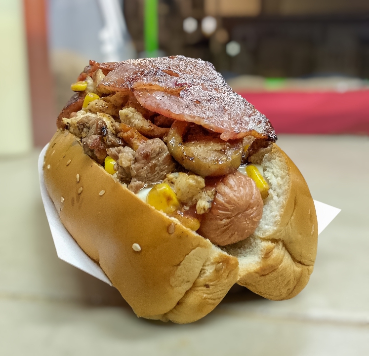 Pan, salchicha super, carne, pollo, tocineta, maiz, chorizo, butifarra, queso mozzarella, salsas y papas ripios.