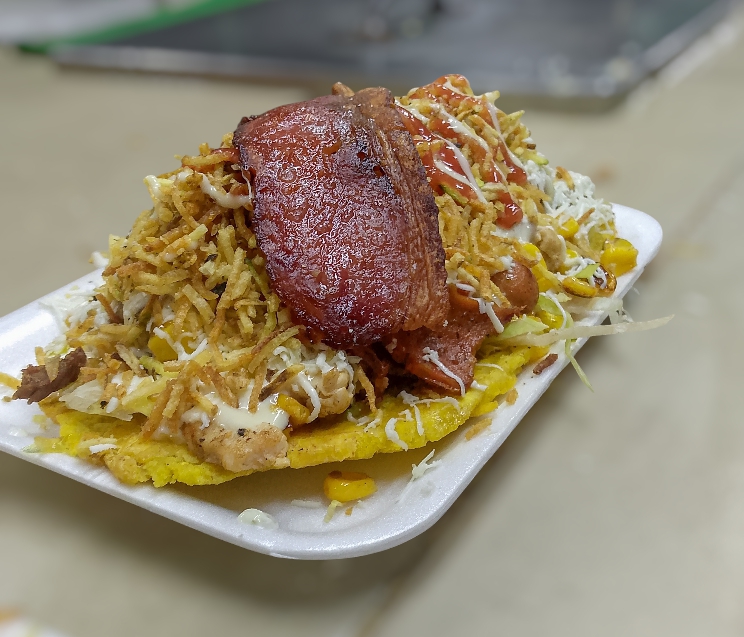 Patacon, carne, pollo, chorizo, butifarra, maiz, tocineta, lechuga, papas ripios y queso.