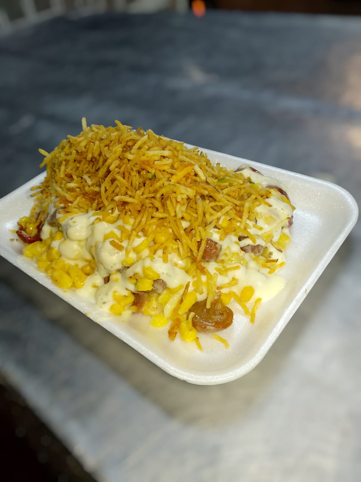 Maiz, chorizo, butifarra, salsas, queso mozzarella, papas ripios.