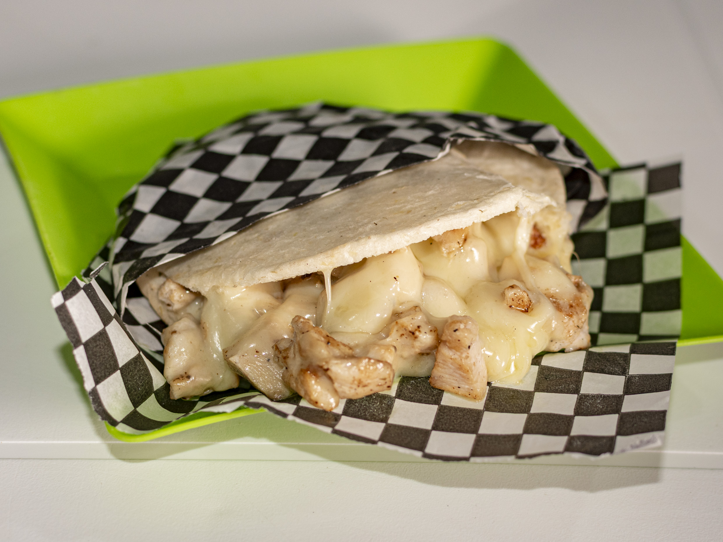 Tortilla artesanal, carne de res, pollo, chorizo, butifarra, queso Costello, verduras, salsas y papas ripios