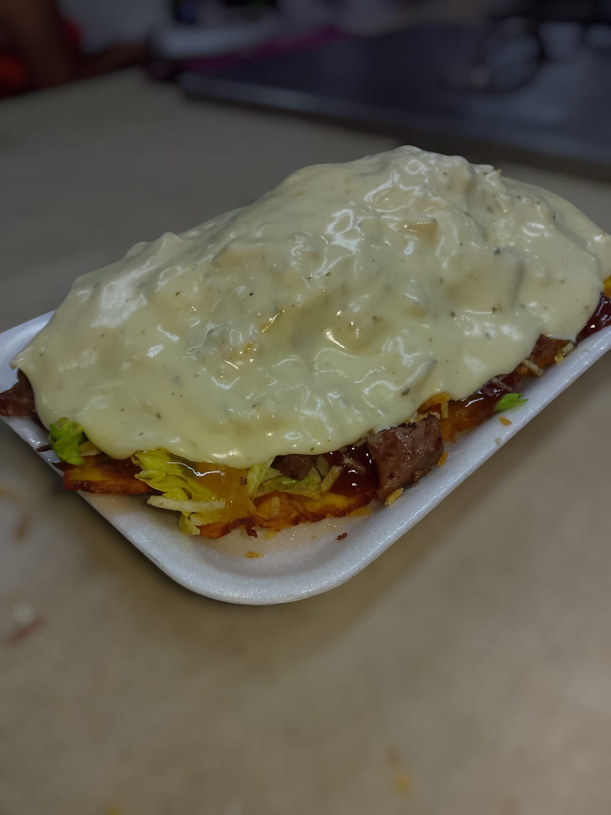 Patacon, carne, pollo, chorizo, butifarra, lechuga, salsas, papas ripios y queso.