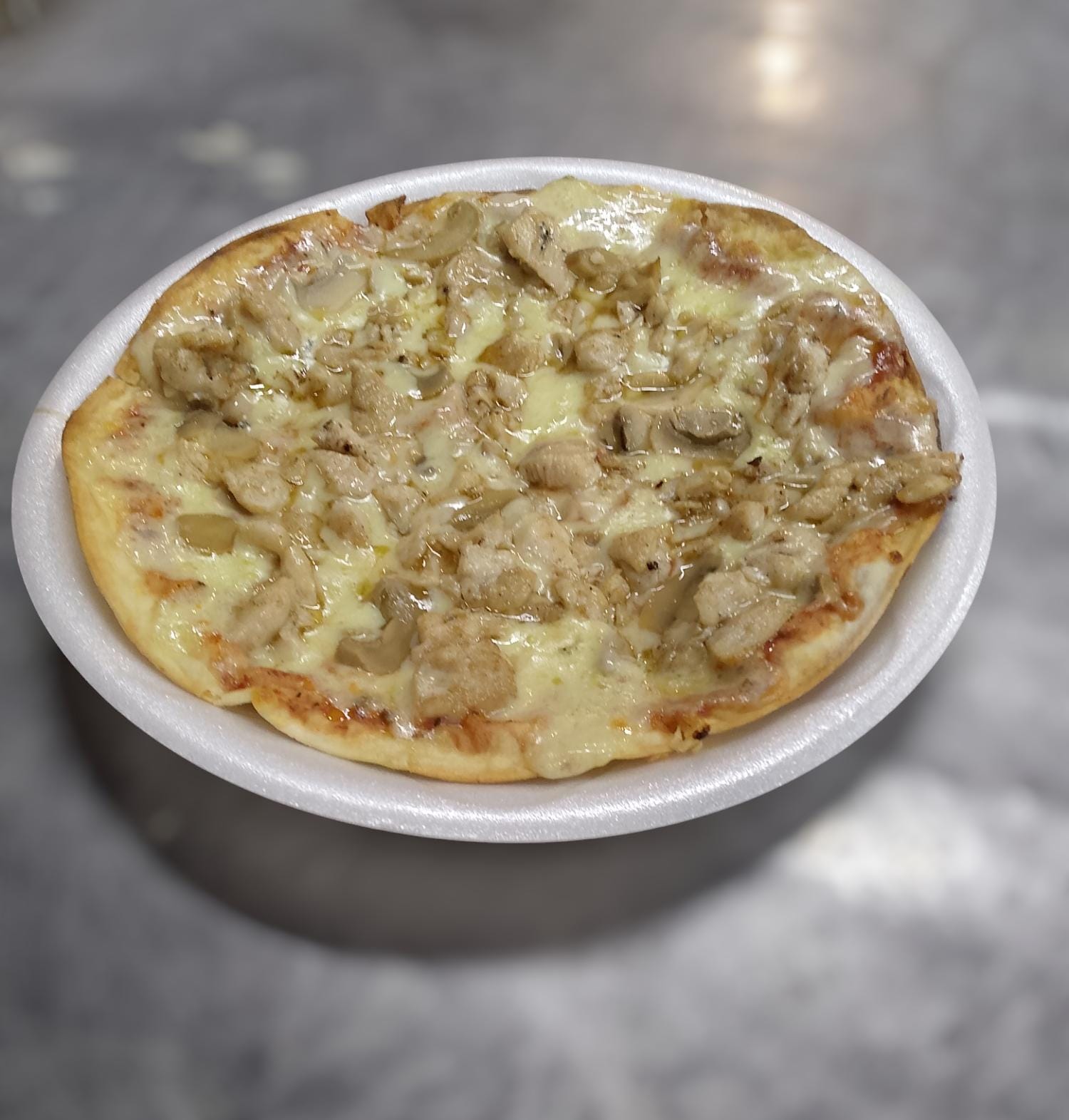 Pasta de tómate, queso mozarrella, pollo y champiñones.