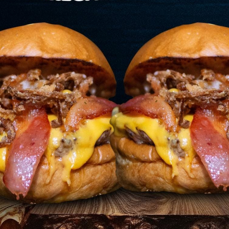 Pan Brioche, 150 g de carne, queso cheddar, mix de cerdo y piña en reducción de wihisky aros de cebolla