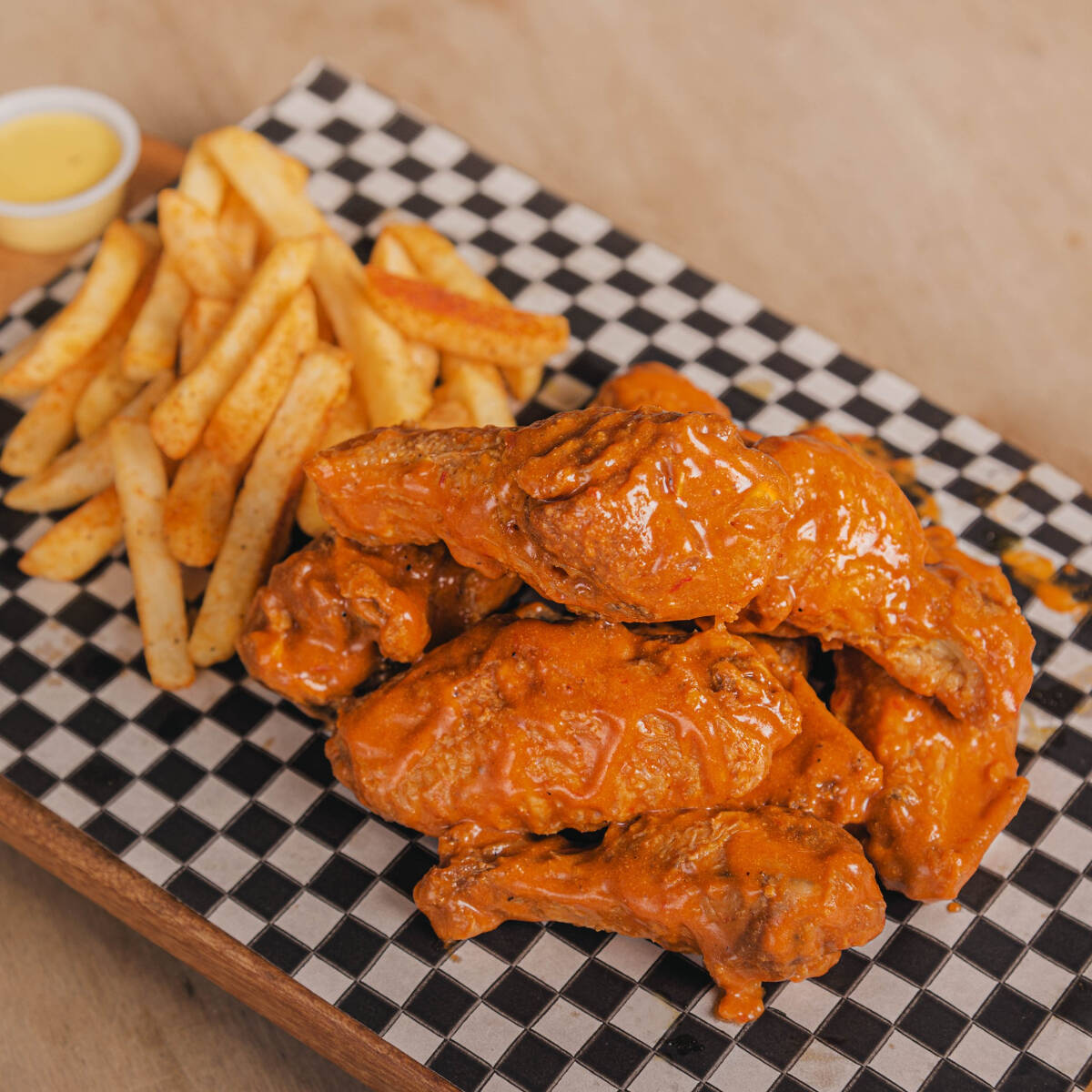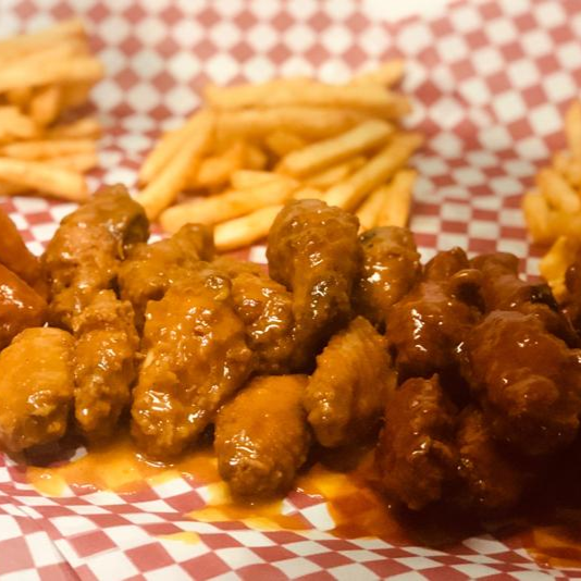 13 Jugosas Alitas con Papas Crujientes