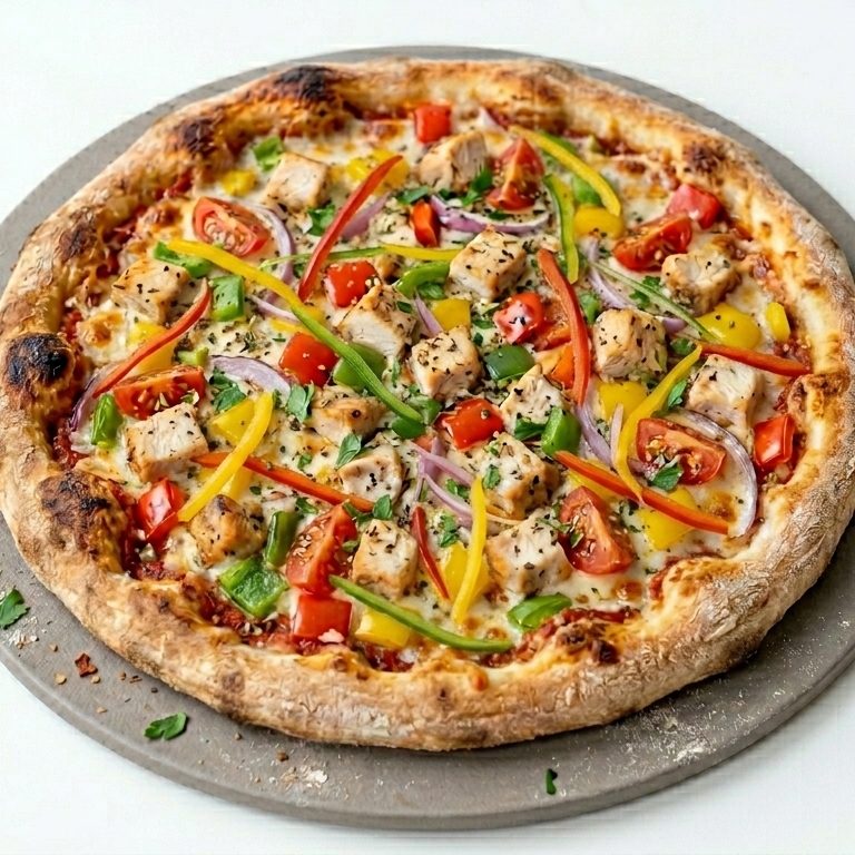 8 porciones - La pizza de pollo con vegetales es una opción deliciosa y fresca, su base está cubierta con una capa de queso fundido que se combina perfectamente con el pollo desmechado, pimentones y cebolla añaden un toque crujiente y lleno de sabor la mezcla de ingredientes crea una combinación ligera y sabrosa.