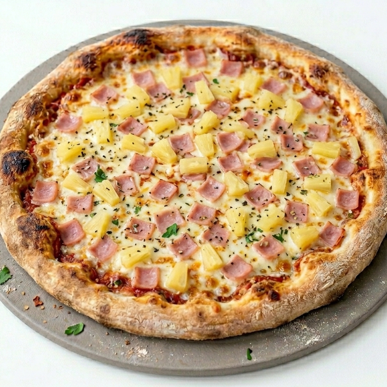 10 porciones - La pizza hawaiana combina la suavidad del queso derretido con el sabor dulce de la piña y el toque salado del jamón, su base de tomate y mozzarella crea una mezcla perfecta de sabores tropicales y tradicionales.