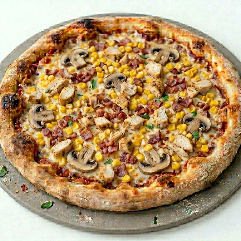 10 porciones - El resultado es una pizza equilibrada entre lo dulce del maíz, lo salado de la tocineta, lo jugoso del pollo y lo umami de los champiñones, todo fundido bajo una capa dorada de queso derretido. Ideal para quienes buscan algo más que una pizza tradicional.