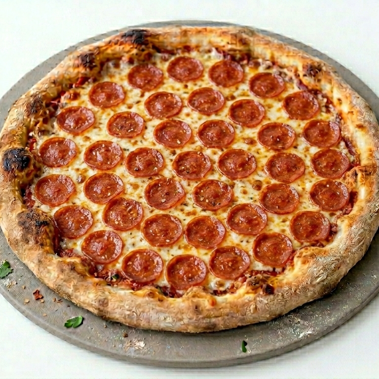 8 porciones - Es un clásico que con base de masa crujiente está cubierta con una capa generosa de salsa de tomate y queso mozzarella derretido sobre ella, con finas rodajas de pepperoni que al hornearse se vuelven crujientes en los bordes y jugosas en el centro, el sabor picante y salado se mezcla perfectamente.