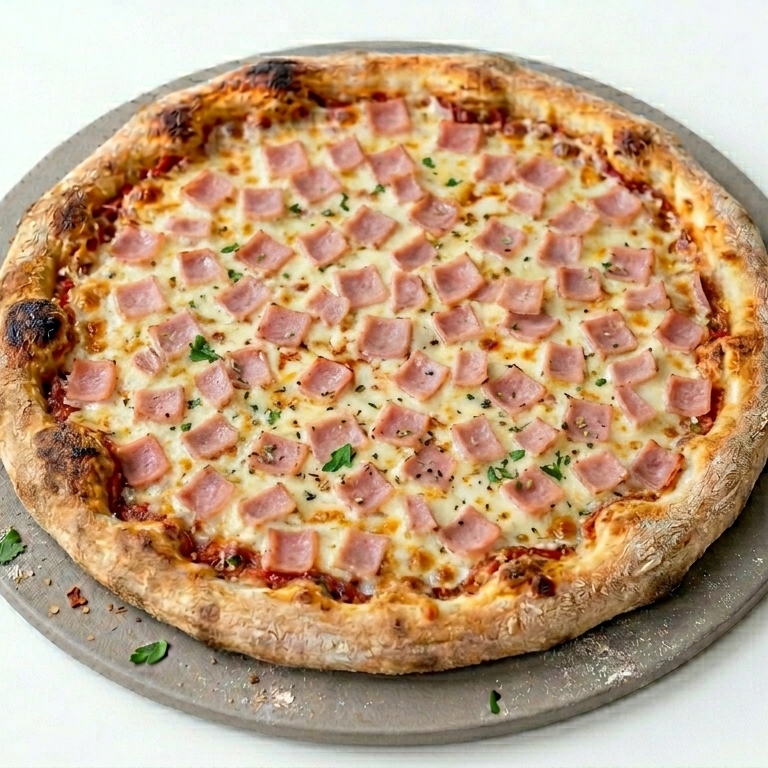 8 porciones - Una combinación de sabores sencillos pero irresistibles, su base crujiente y dorada está cubierta con una capa generosa de salsa de tomate sobre la que se esparce un queso derretido y fundente, finas lonchas de jamón se colocan sobre el queso, añadiendo un toque suave y sabroso.