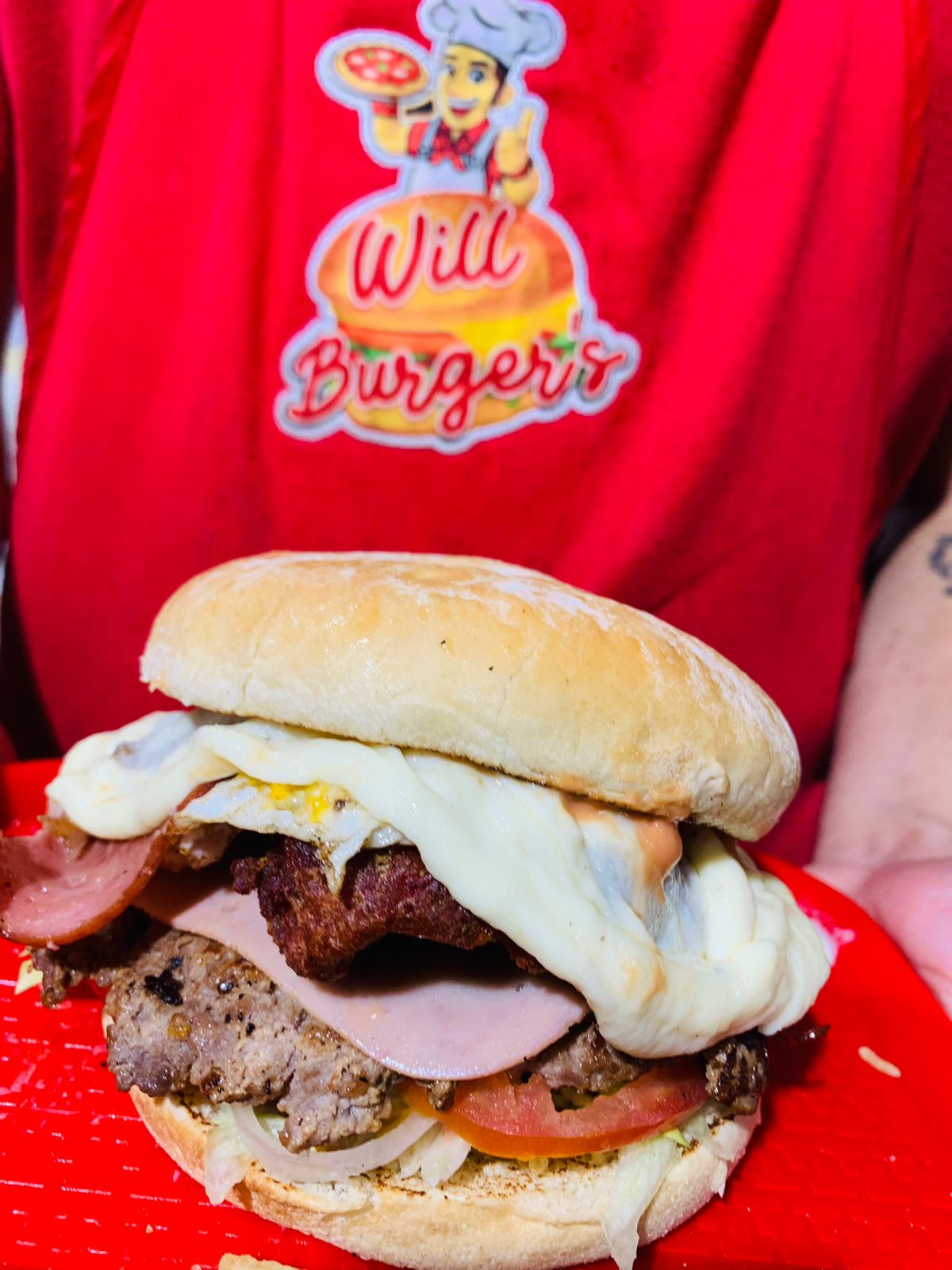 Pan Artesanal, 100gr Carne de la casa, 100gr Pollo a la plancha, Salchicha Ranchera, doble queso Cheddar, doble Tocineta,doble jamon, huevo frito, y salsas. 1 porcion de papas a la francesa.