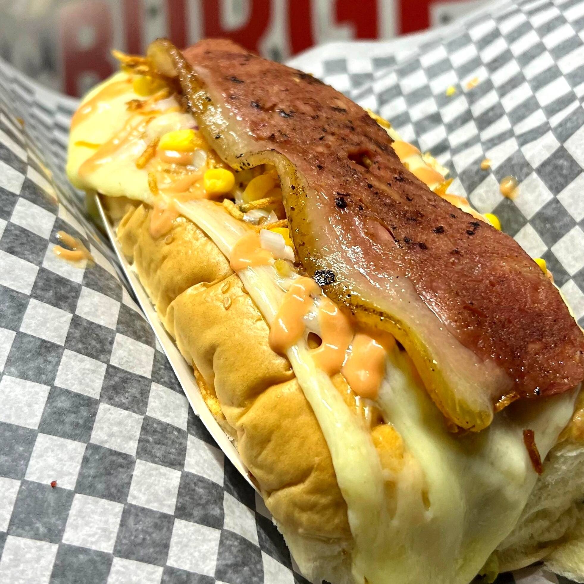 Pan súper, salchicha Suiza, Maíz, Papa Ripio, Queso Mozzarella, tocino, Lechuga y Salsas de la Casa.