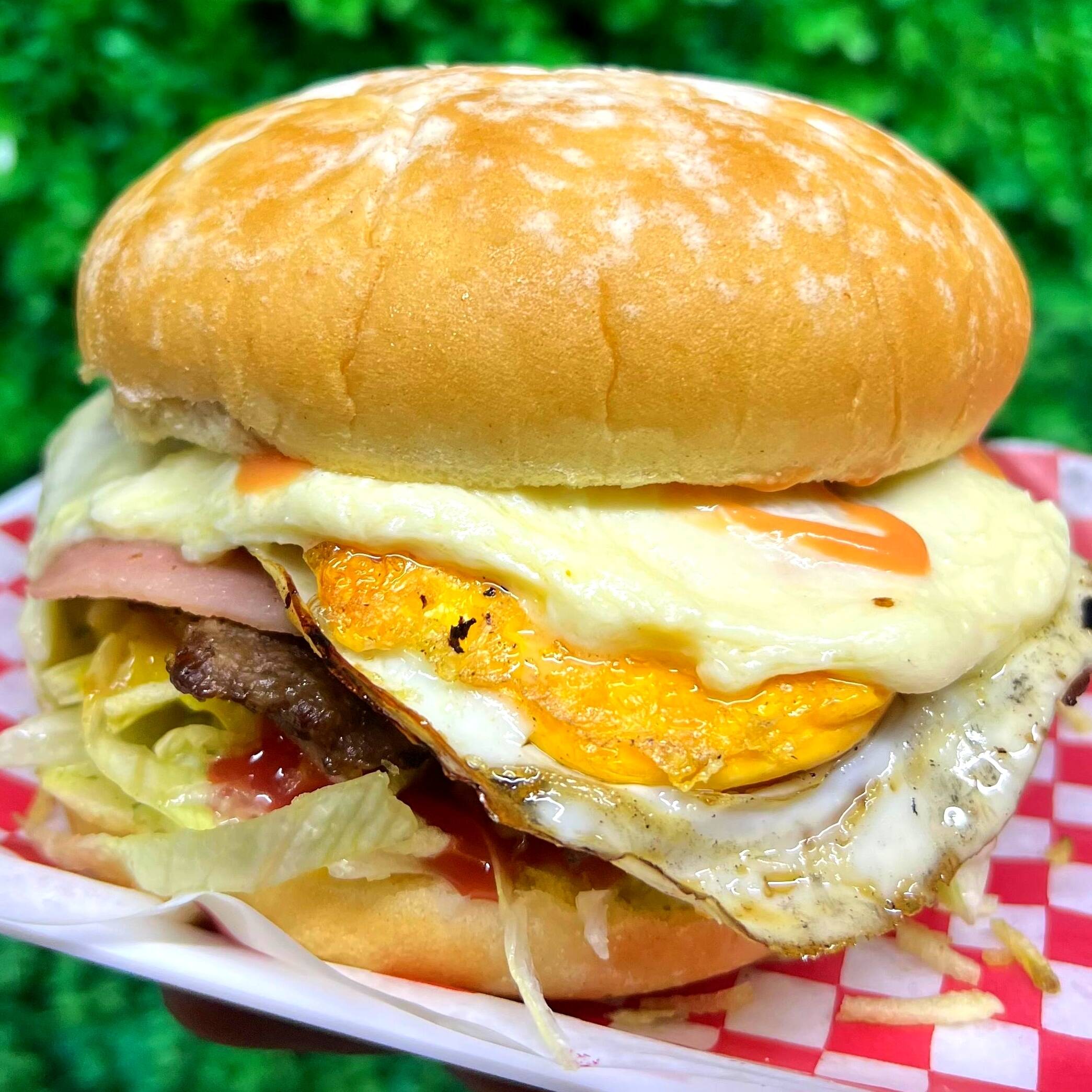 Pan artesanal , 300gr Carne, jamon, queso mozarella, huevo frito, lechuga, tomate cebolla y salsas de la casa