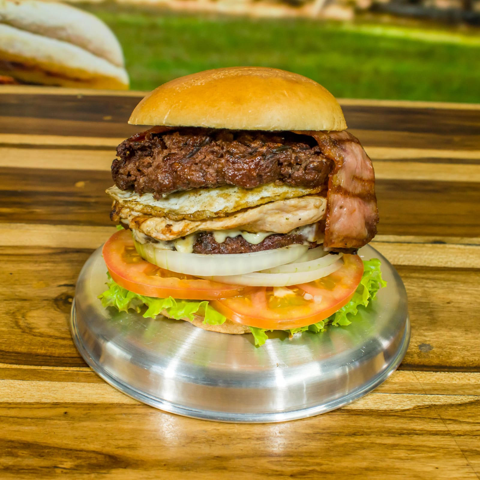 Pan Artesanal, Doble Croqueta de Carne, Filete de Pollo, Huevo Frito, Tocineta, Queso y vegetales