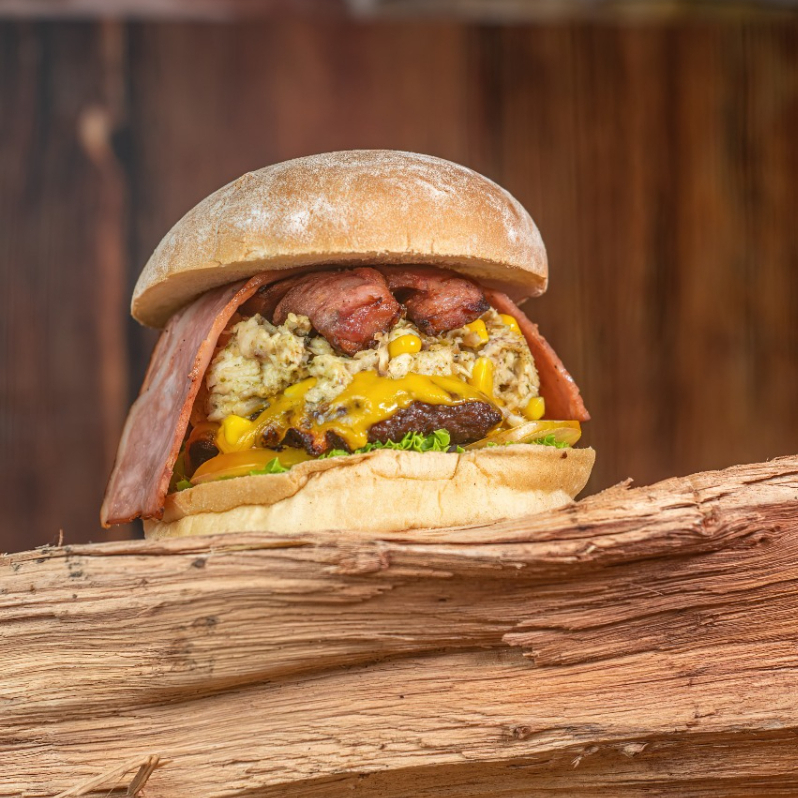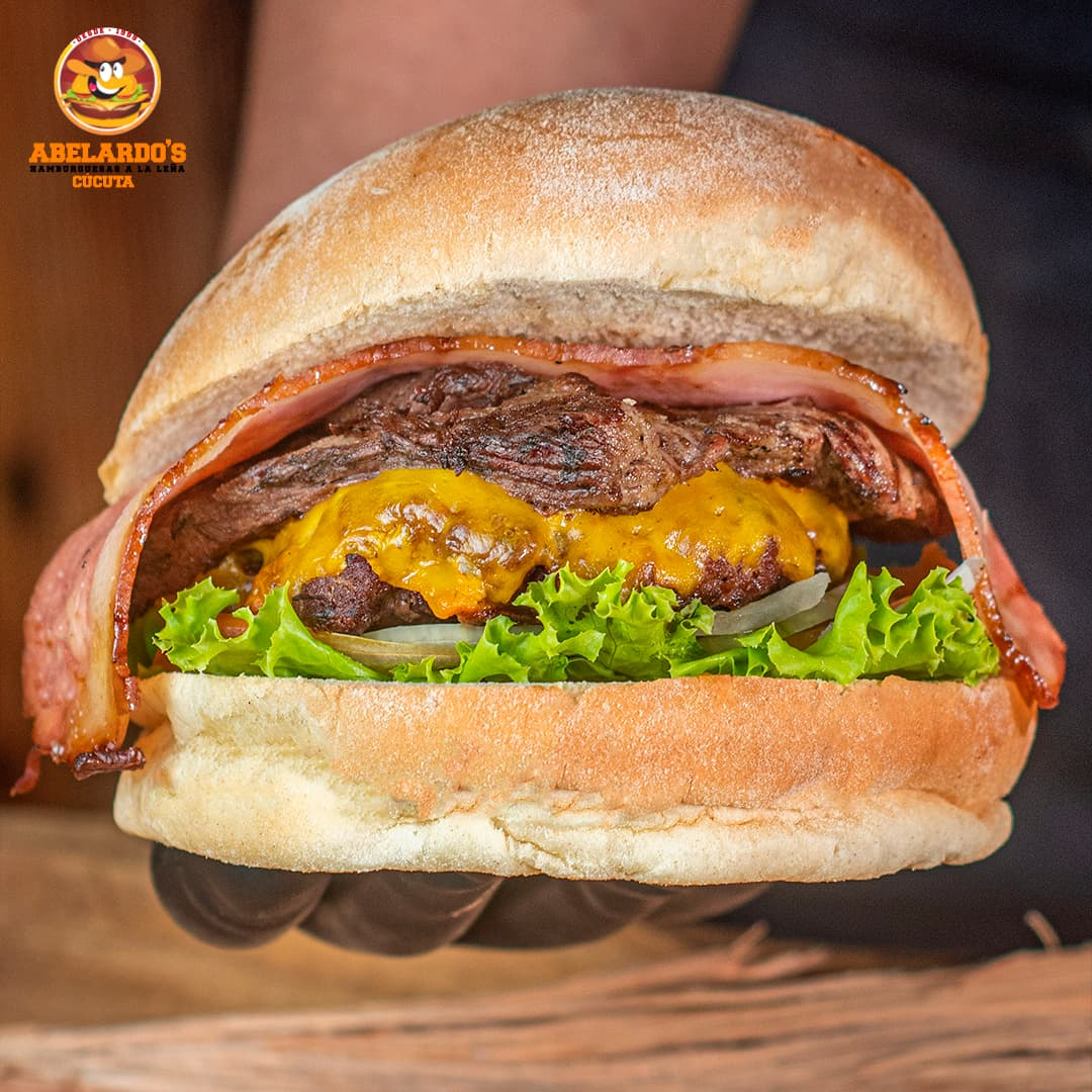 Pan Artesanal, Croqueta de Carne, Filete de Pollo o mechado, Tocineta, Queso cheddar y vegetales