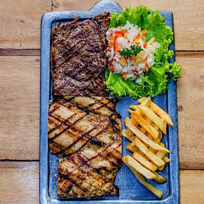 Filete de Pollo y Filete de Lomito 250 gr, Papas a la Francesa, pico de gallo