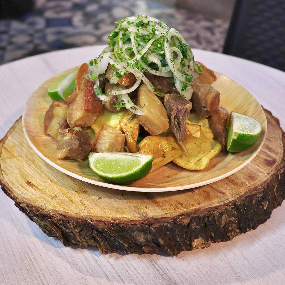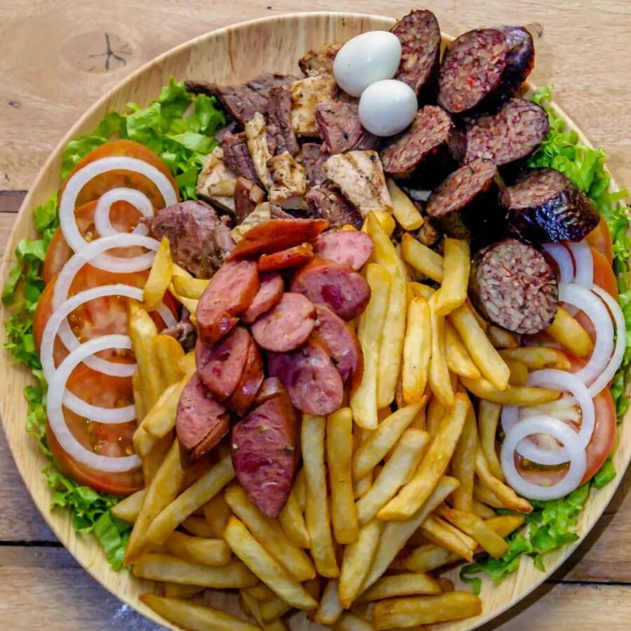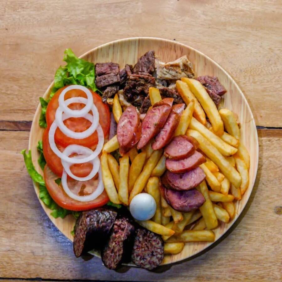 Carne, pollo, chihcarroncitos, morcilla, chorizo, patacones, papa criolla, papa a la francesa, huevo codorniz, ensalada fresca.
