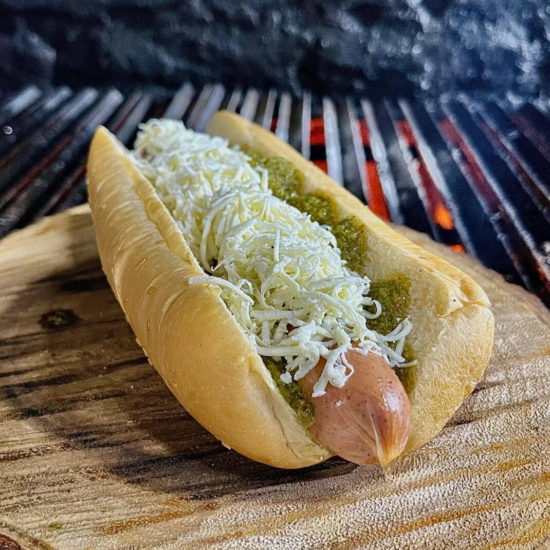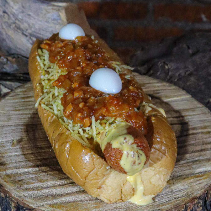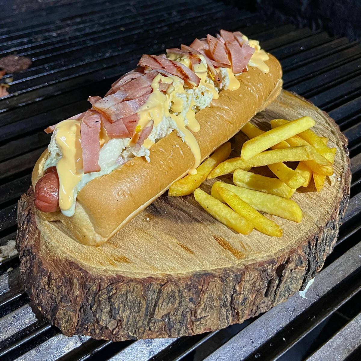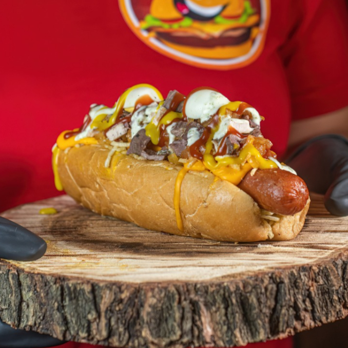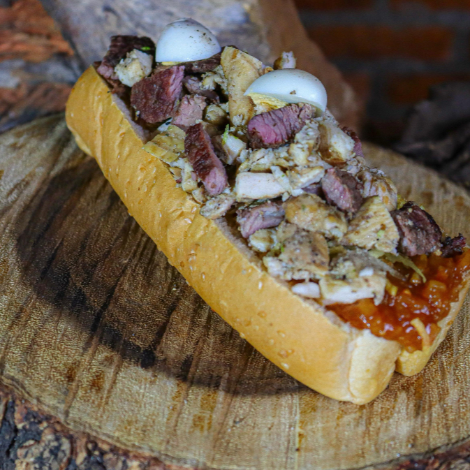 Pan Artesanal, Pollo Mechado, Croqueta de Carne, Tocineta, Queso, Chorizo, Maíz, Lechuga, Cebolla y Tomate