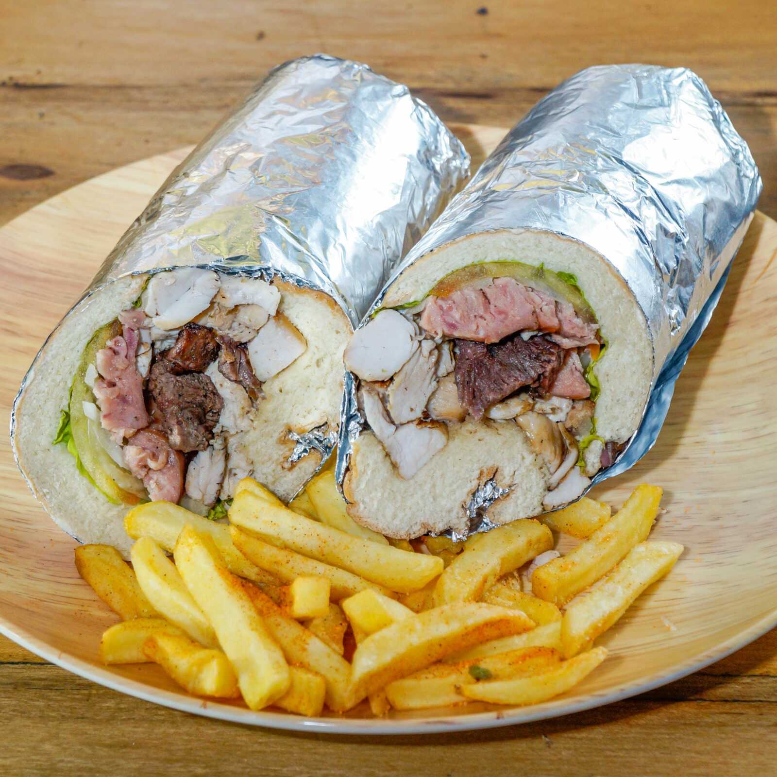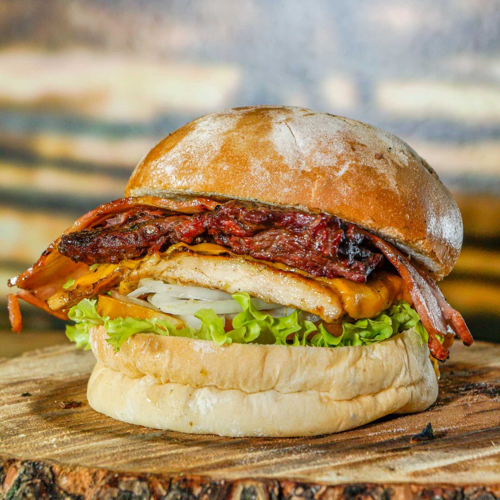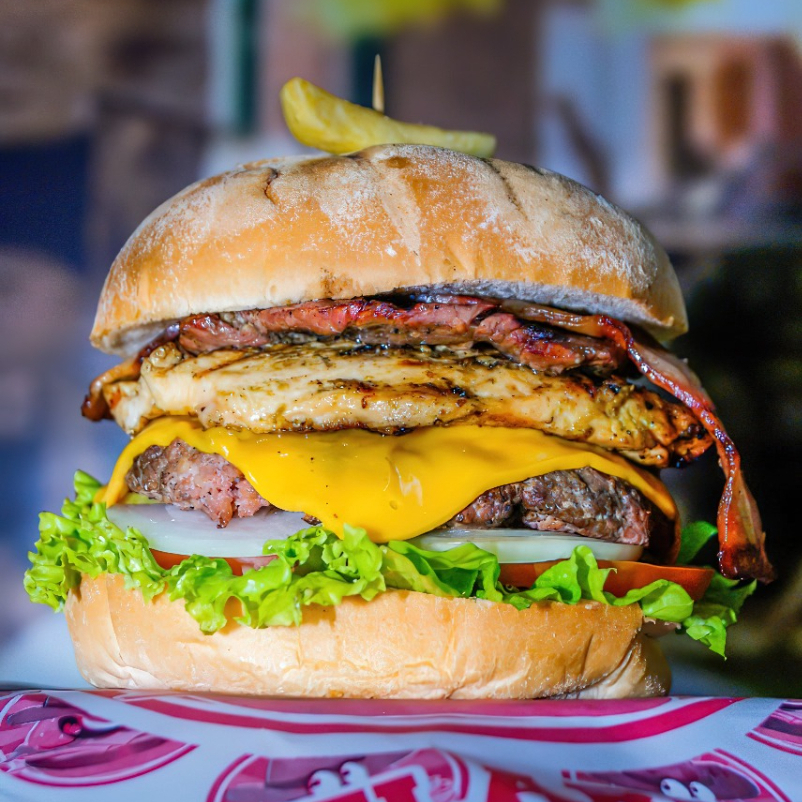 Pan Artesanal, filete de lomito de res, pollo , Croqueta de Carne, Tocineta, Queso cheddar, Chorizo y vegetales