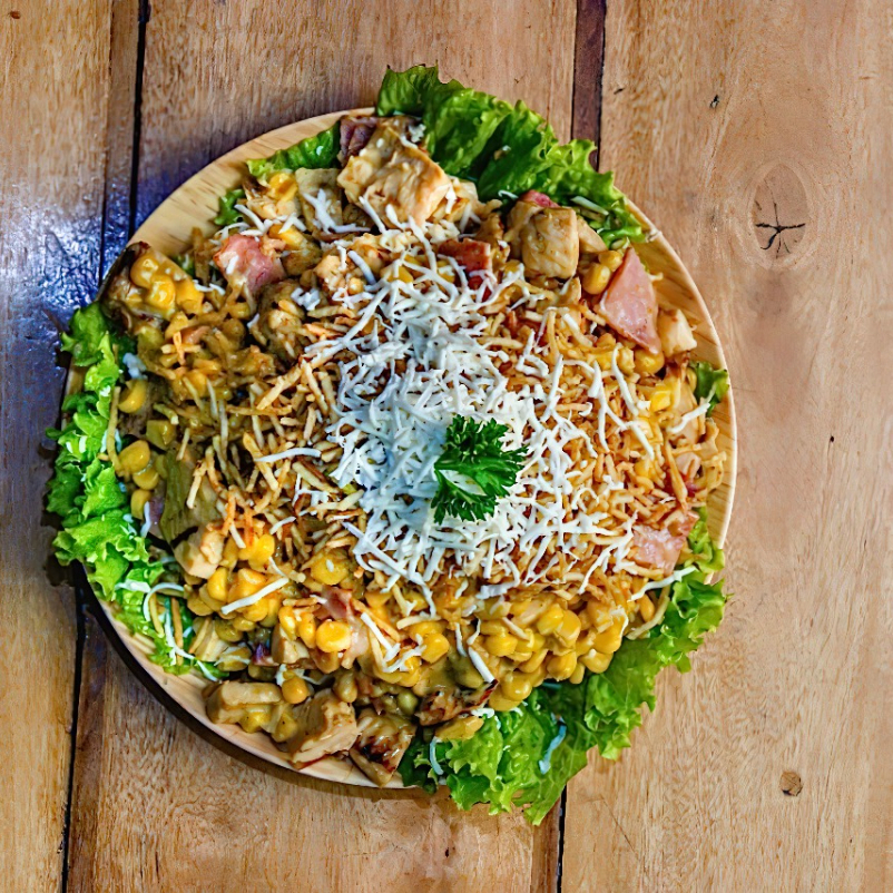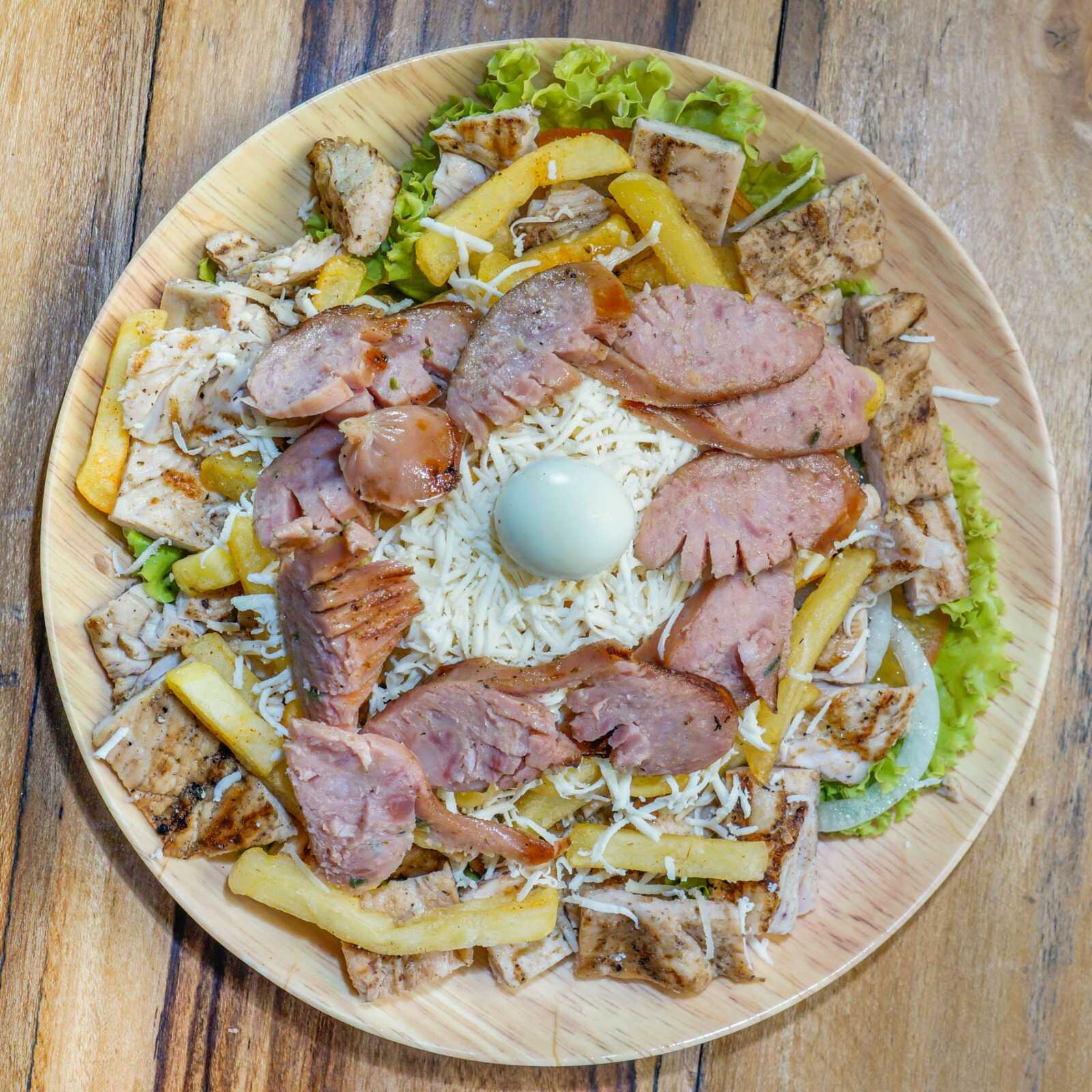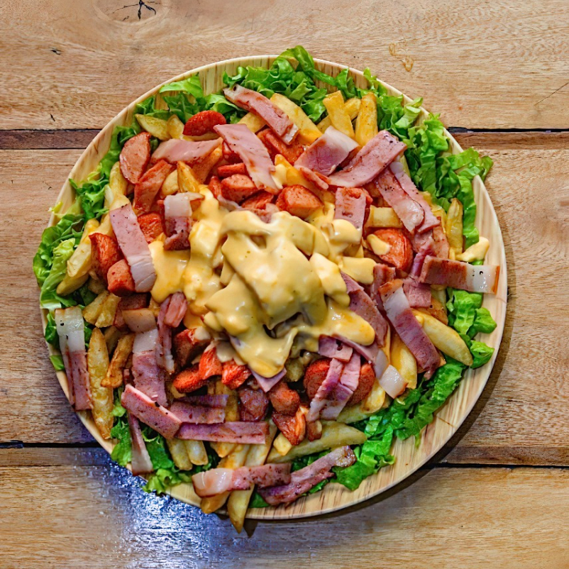 Carne picada , pollo, salchicha americana, tocineta, queso fundido,, papa a la francesa, chorizo , maiz y salsa de la casa.