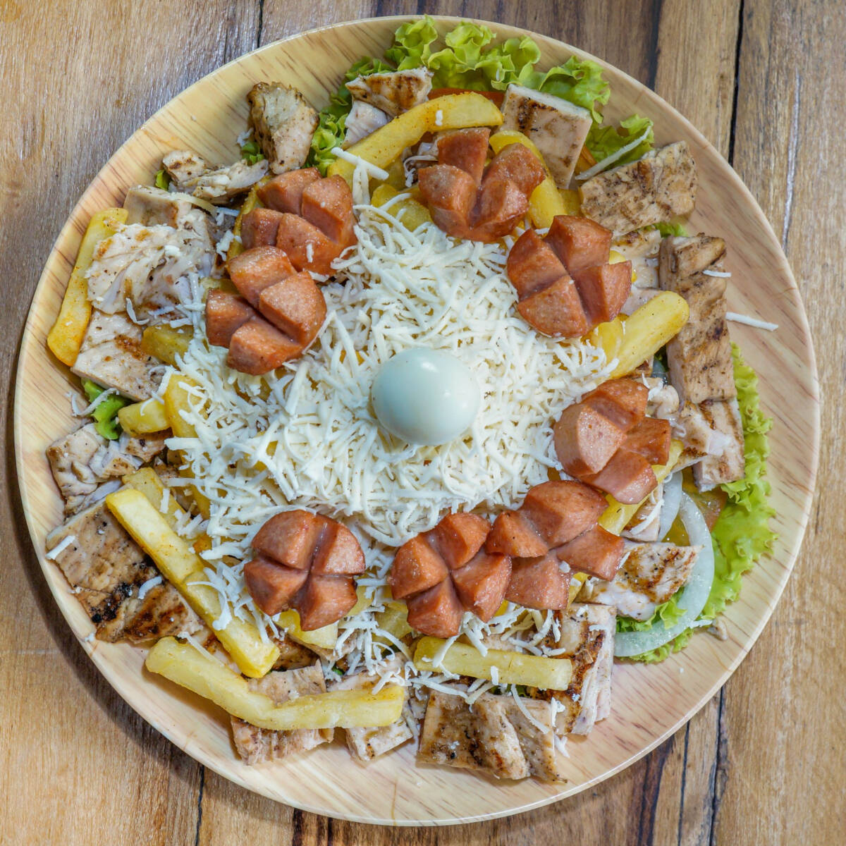 Pollo picado, salchicha americana, papa a la francesa, queso rallado, huevos de codorniz y vegetales