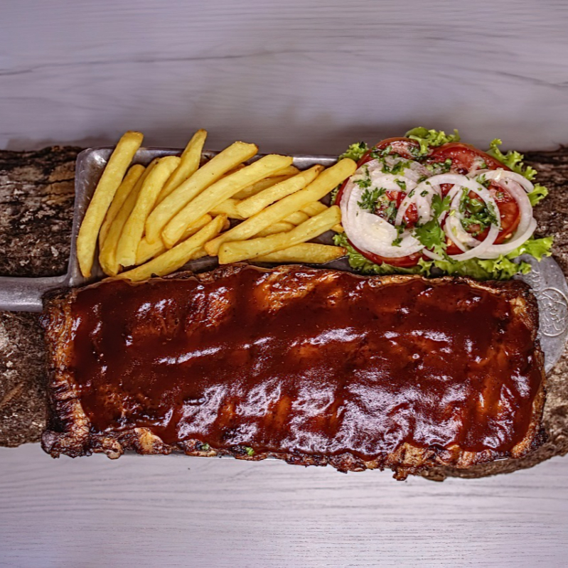 Costillas de Cerdo bbq 500g, Papa a la Francesa y ensalada