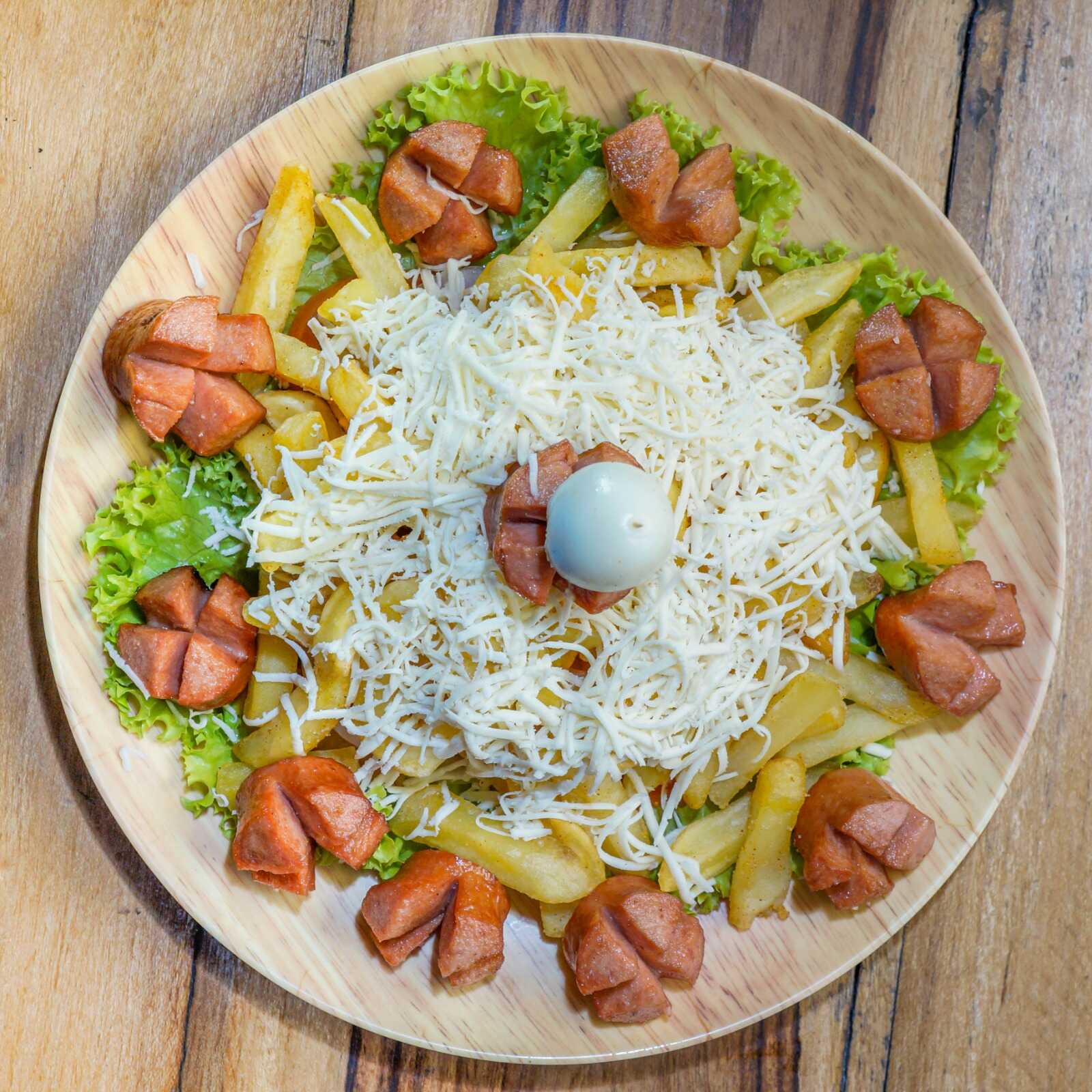 Salchicha Americana, Pollo picado, Queso, Huevo de Codorniz, Papa a la Francesa y Vegetales
